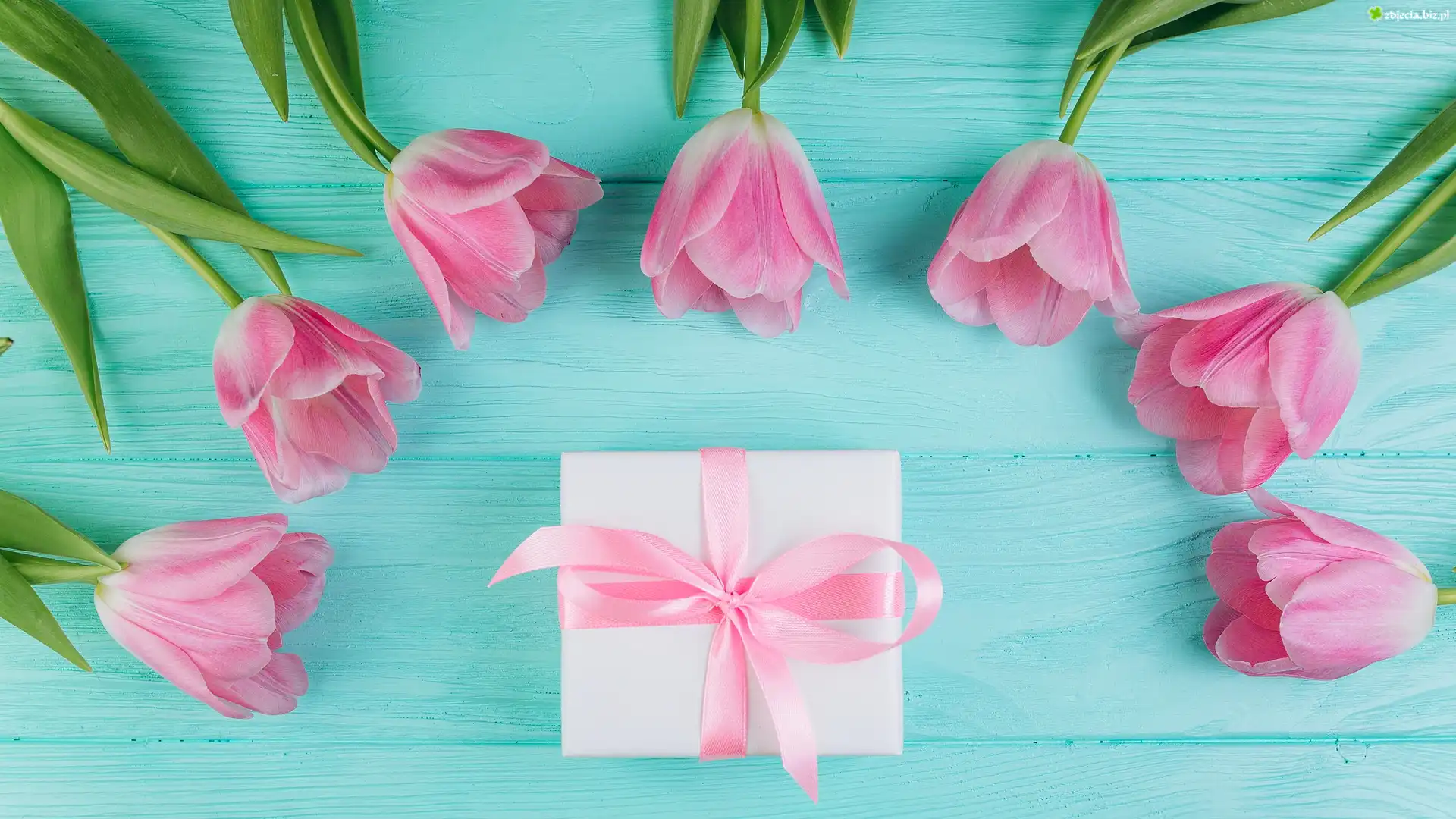 Zdjęcie Kwiaty, Różowe, Tulipany, Prezent, Wstążka, Drewniane, Deski