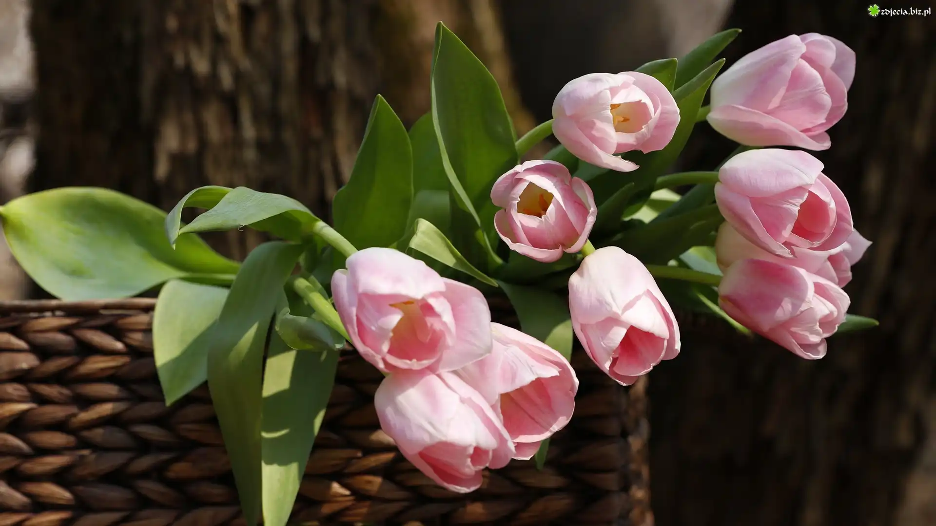 Zdjęcie Kwiaty, Różowe, Tulipany, Bukiet, Koszyk, Rozmyte, Tło