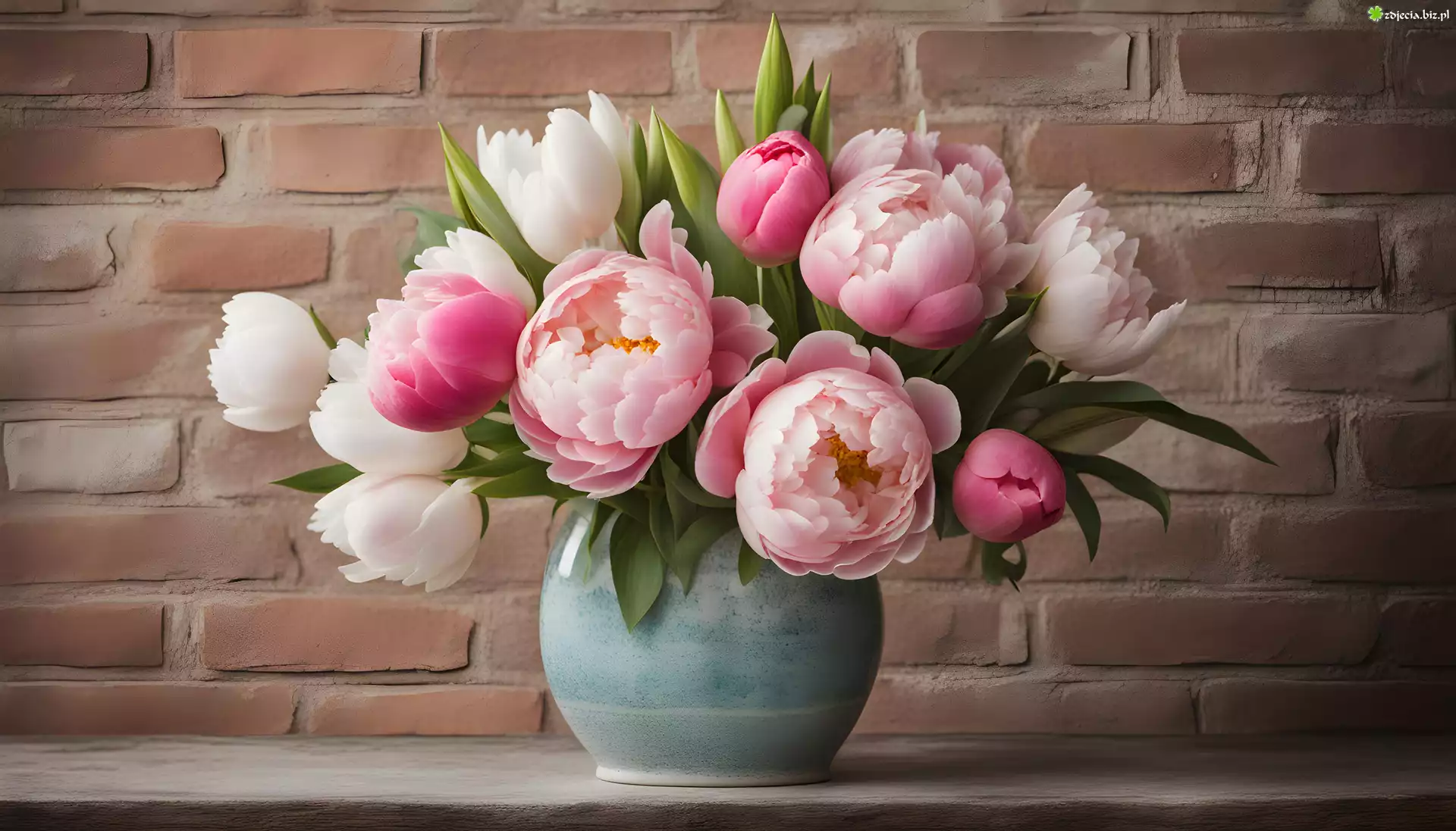 Zdjęcie Kwiaty, Piwonie, Białe, Różowe, Wazon, Mur
