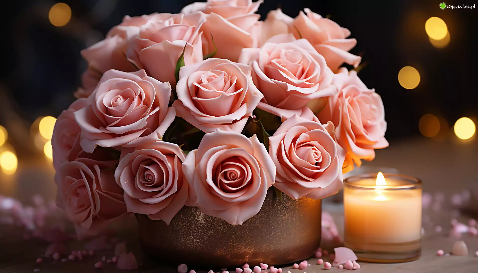 Zdjęcie Bukiet, Różowe, Róże, Wazon, Świeczka