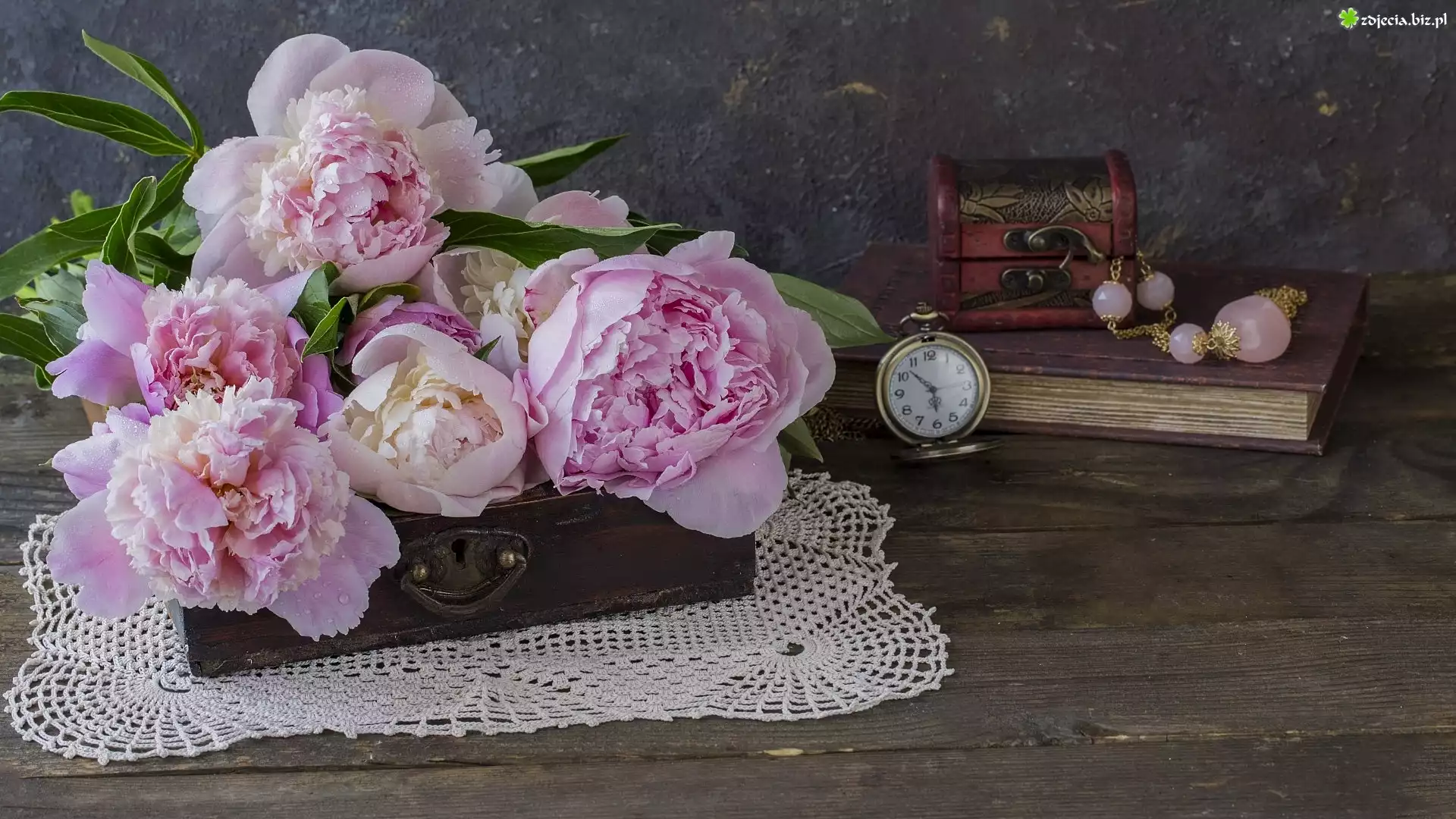 Zdjęcie Kwiaty, Różowe, Piwonie, Szkatułka, Kuferek, Książka, Zegarek, Serwetka