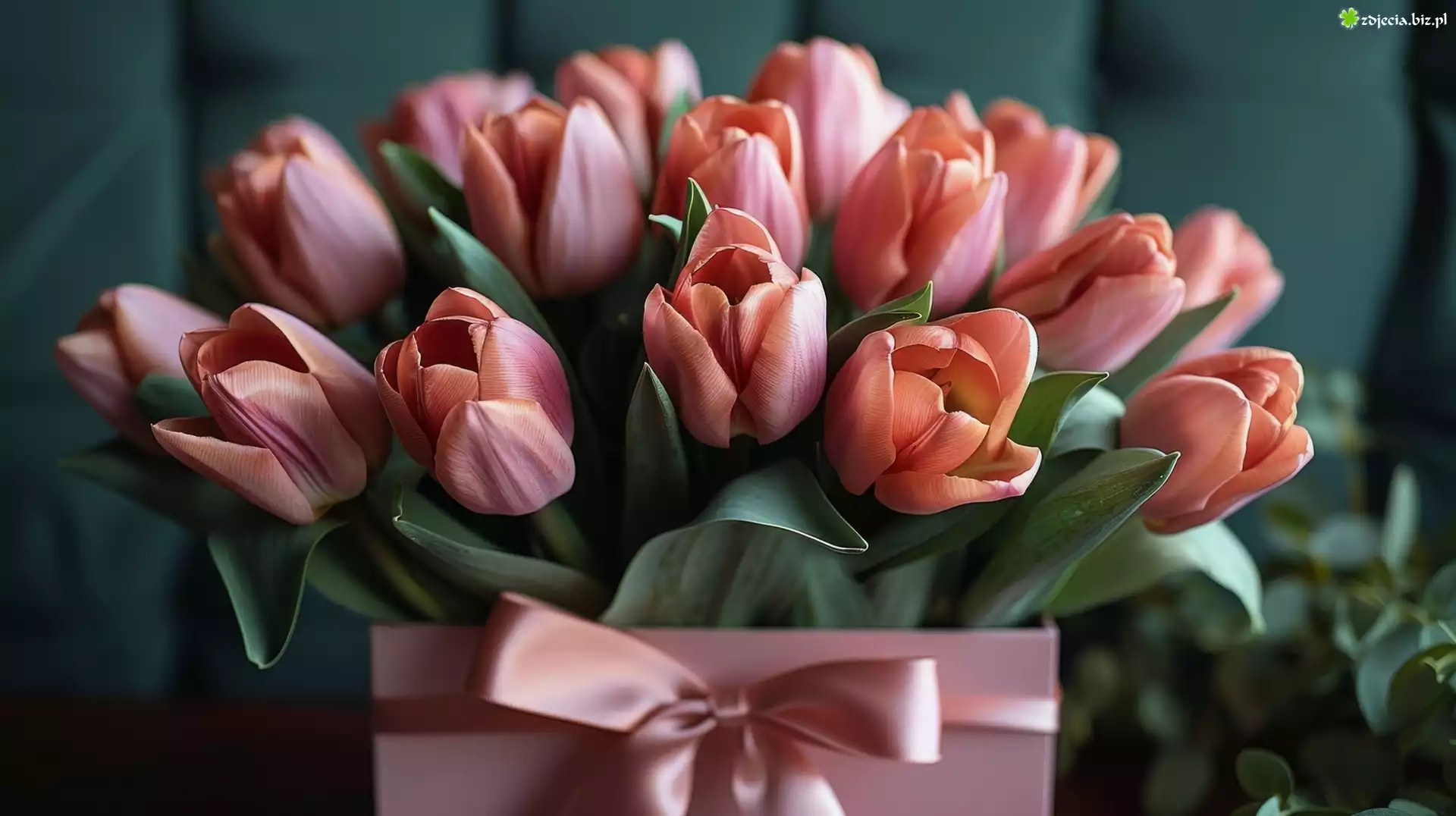 Zdjęcie, Bukiet, Różowe, Tulipany, Pudełko, Kokarda