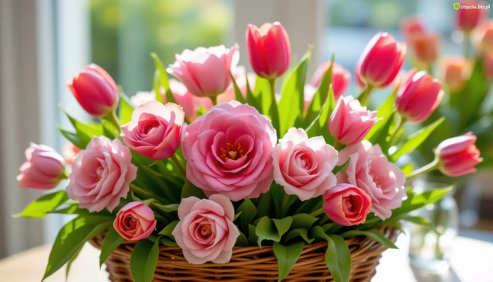 Zdjęcie Kwiaty, Różowe, Tulipany, Róże, Koszyk