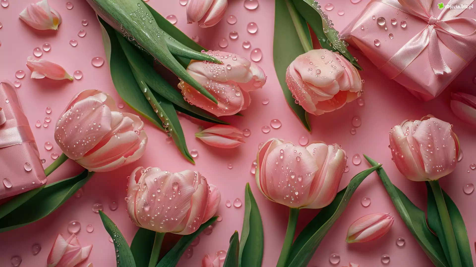 Zdjęcie Kwiaty, Różowe, Tulipany, Krople, Prezent