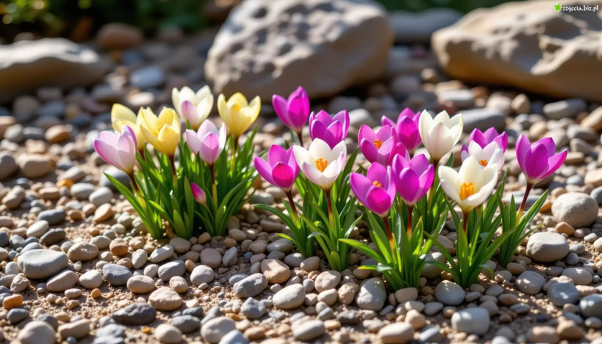 Zdjęcie Białe, Różowe, Żółte, Krokusy, Kamienie