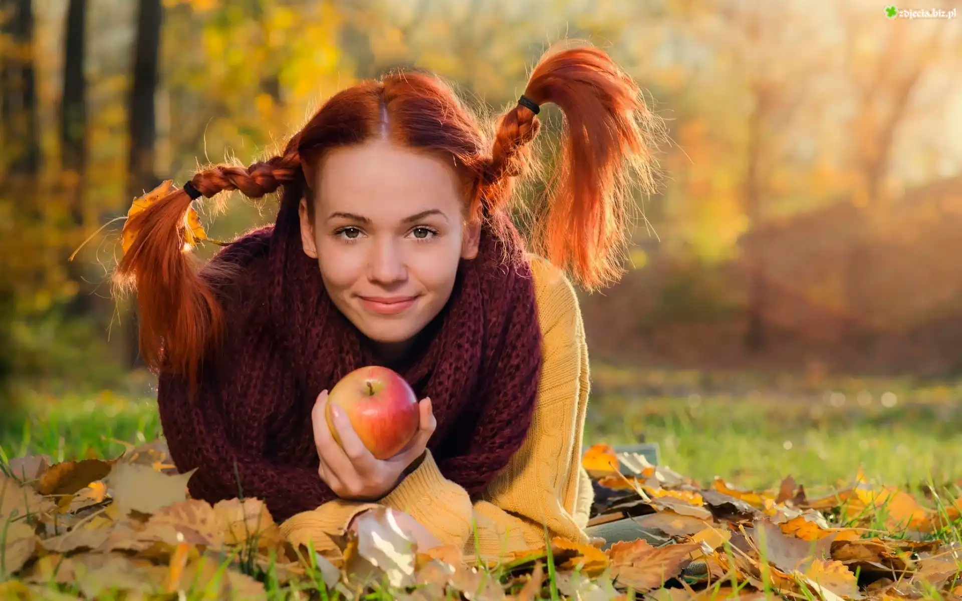 Zdjęcie Kobieta, Rude, Włosy, Warkocze, Jesień, Liście, Jabłko