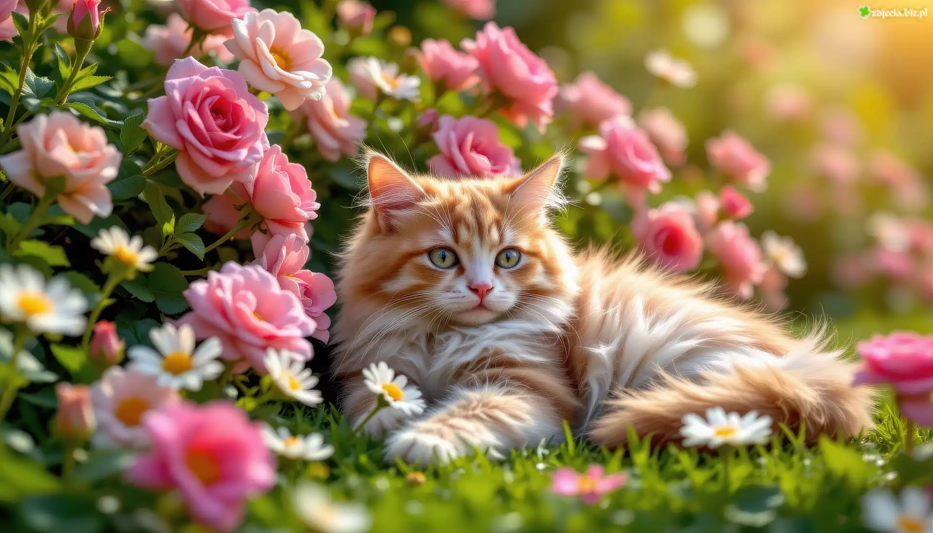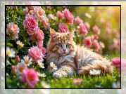 Zdjęcie Leżący, Rudo-biały, Kot, Kwiaty