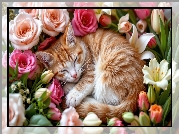 Zdjęcie Śpiący, Rudo-biały, Kot, Kwiaty