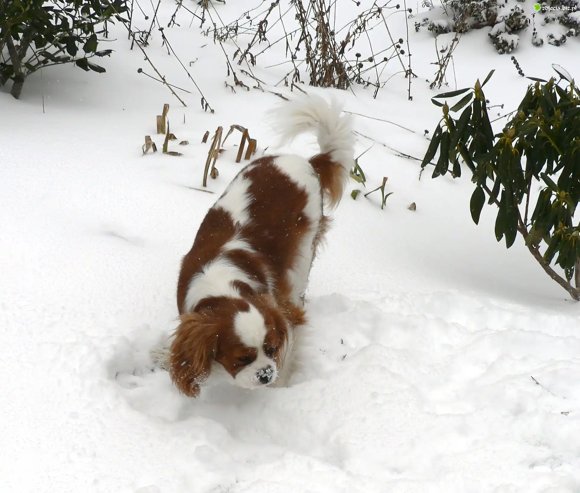 Zdjęcie Rudo-biały, King Charles Spaniel, śnieg