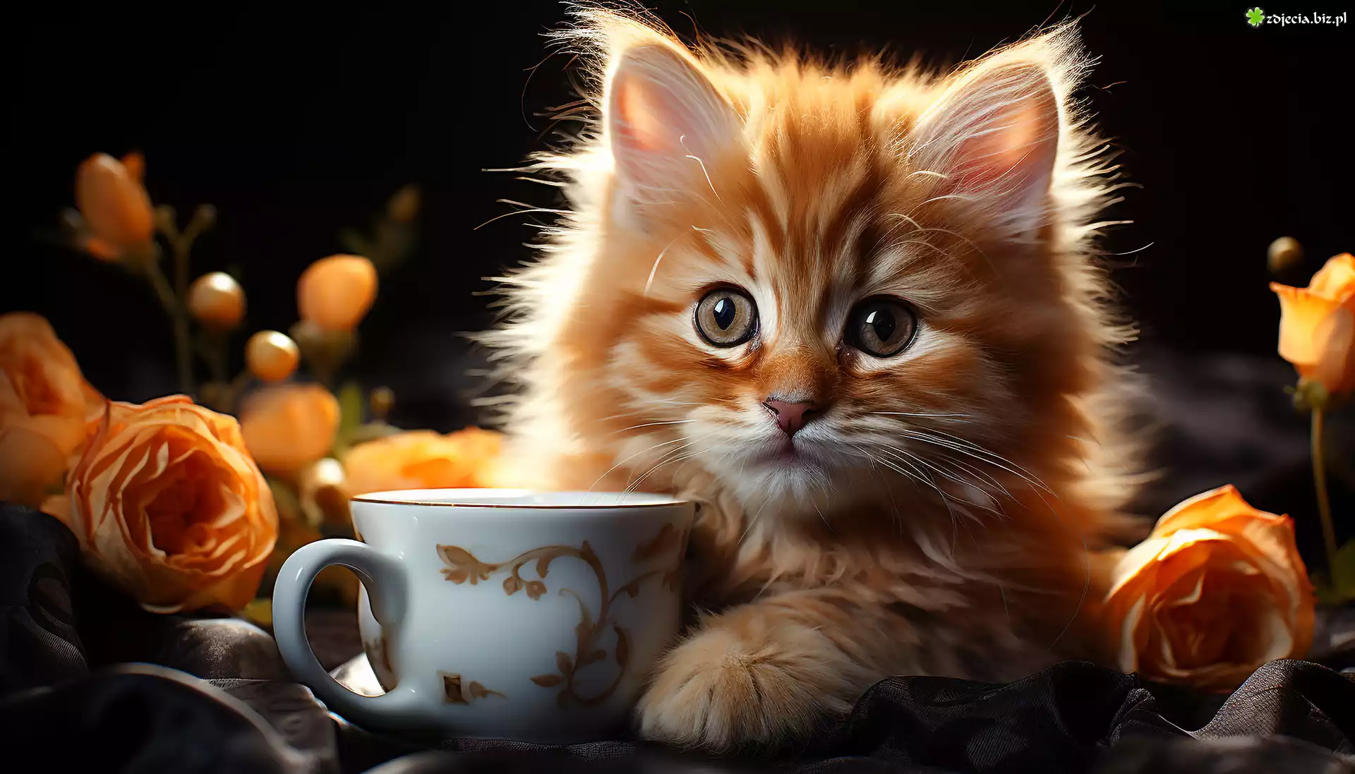 Zdjęcie Mały, Rudy, Kotek, Filiżanka, Róże