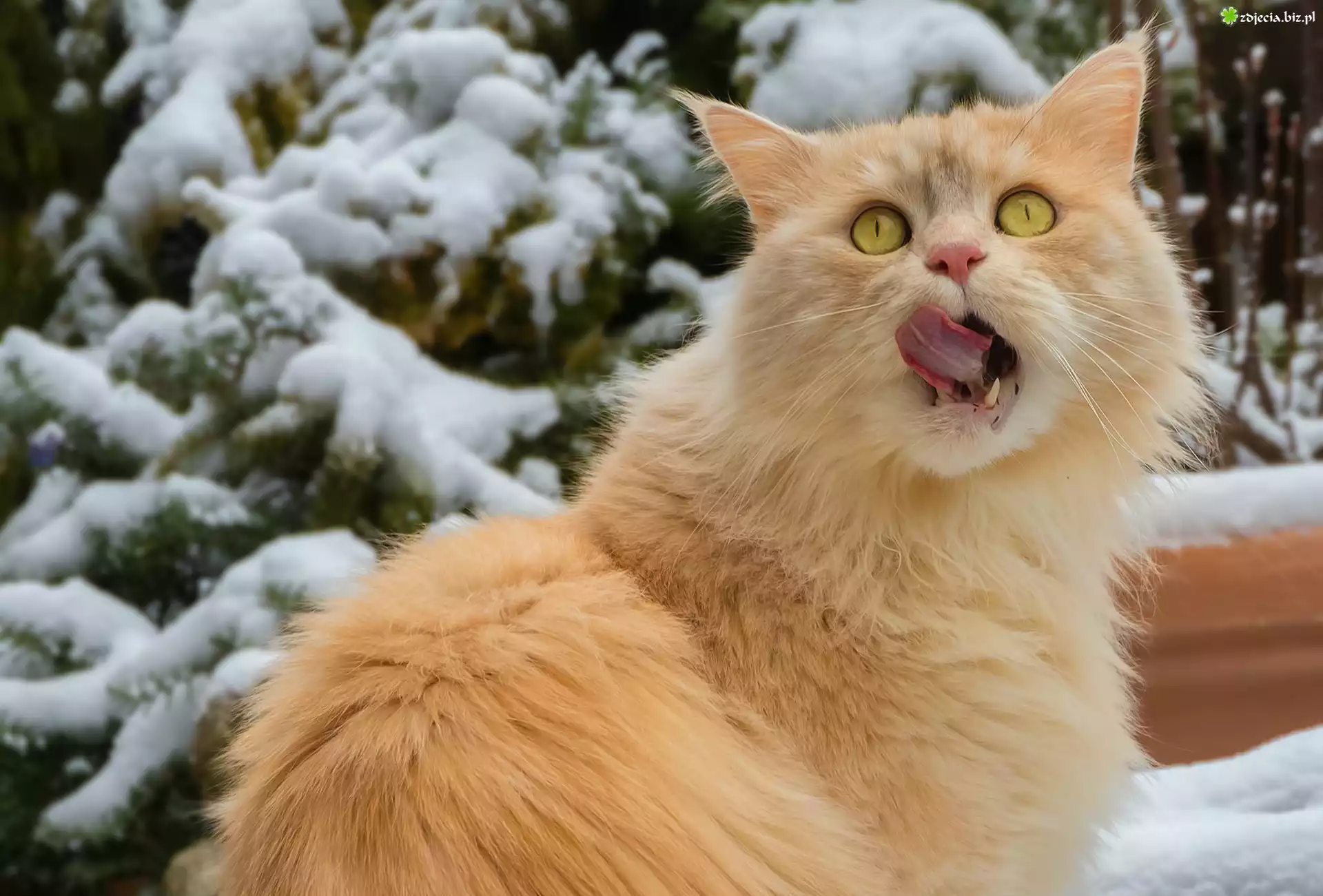 Zdjęcie, Rudy, Kotek, Śnieg, Język