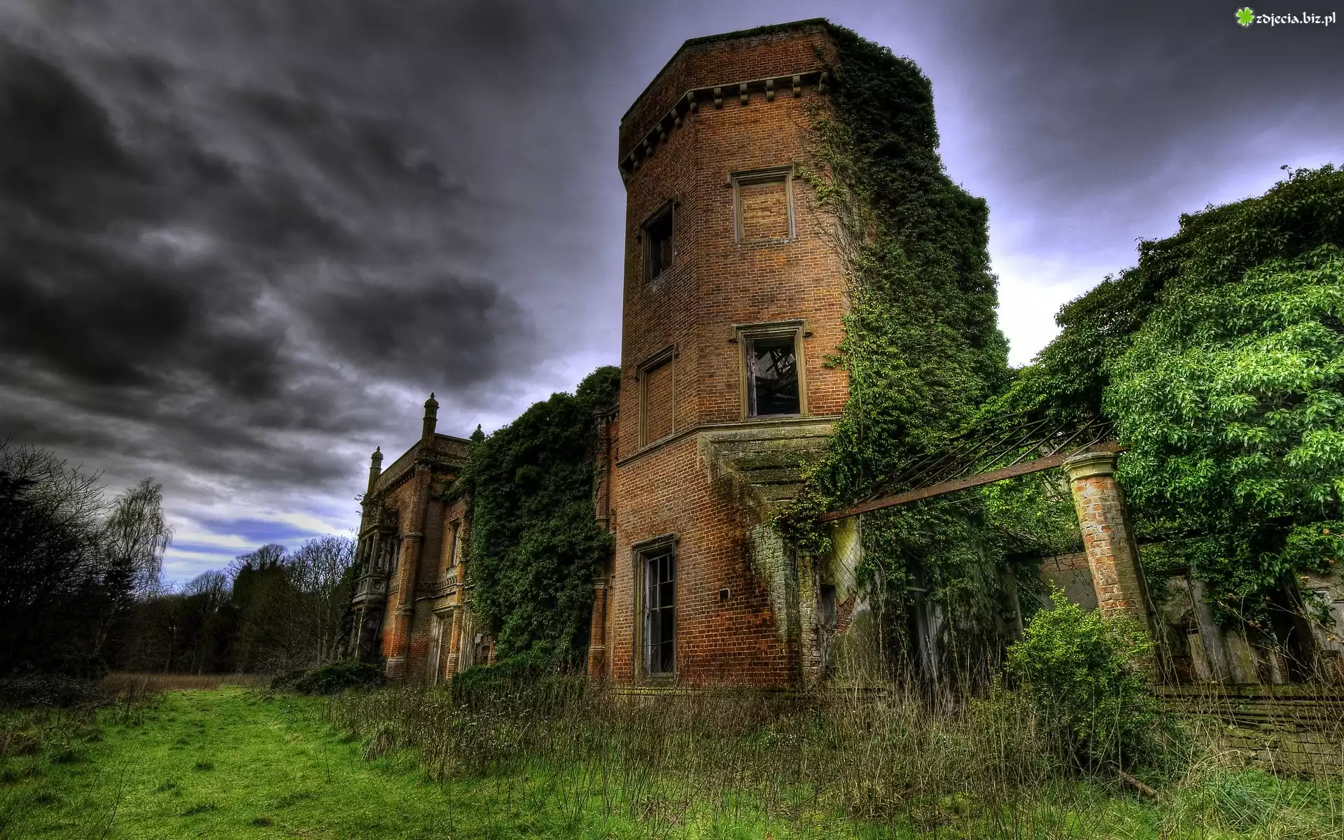 Zdjęcie, Ruiny, Pokryte, Roślinami, Burzowe, Chmury