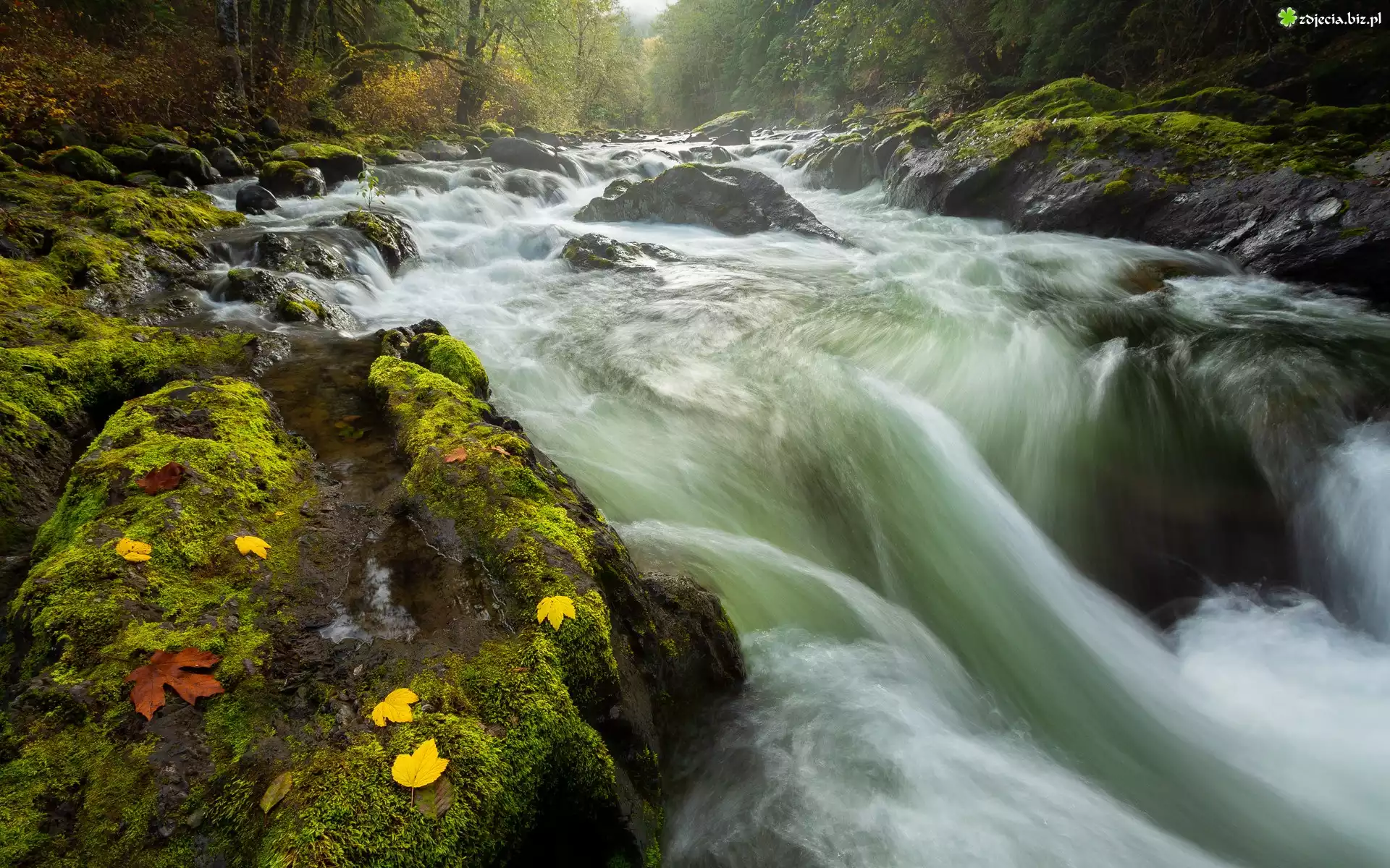Zdjęcie Rwąca, Rzeka, Omszałe, Skały, Kolorowe, Listki