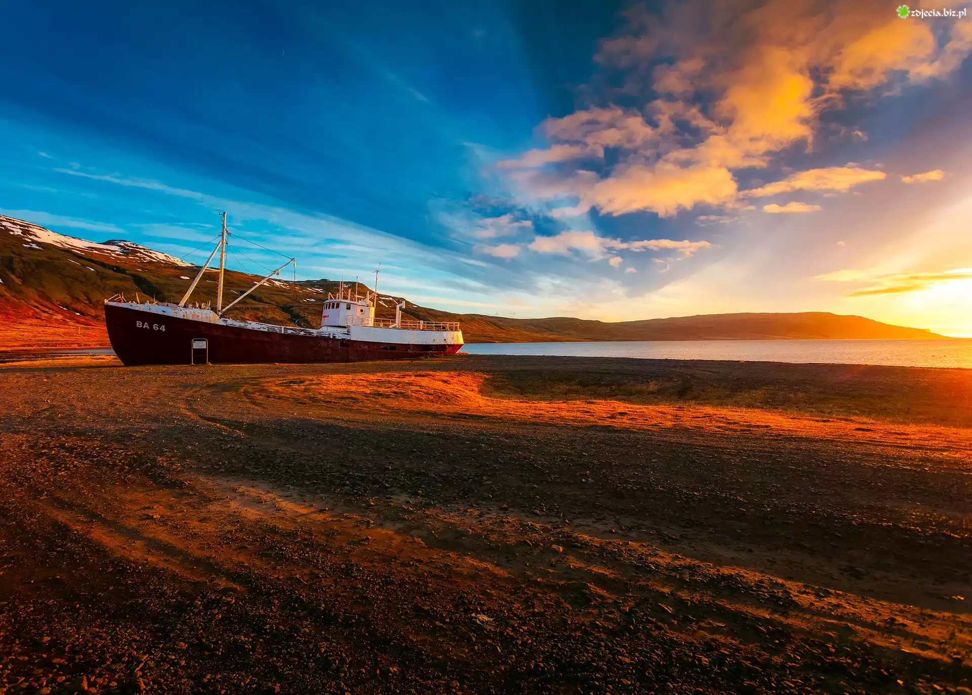 Zdjęcie Statek, Rybacki, Brzeg, Morza, Niebo, Zachód słońca, Chmury