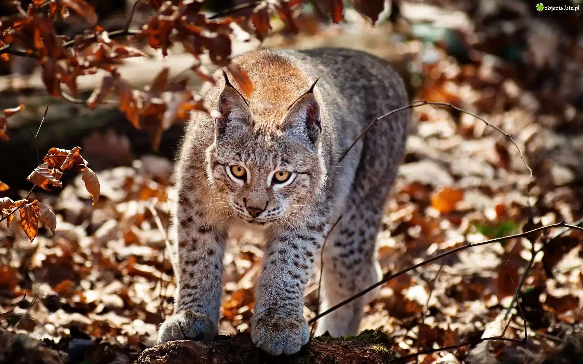 Zdjęcie Ryś, Las, Liście, Jesień