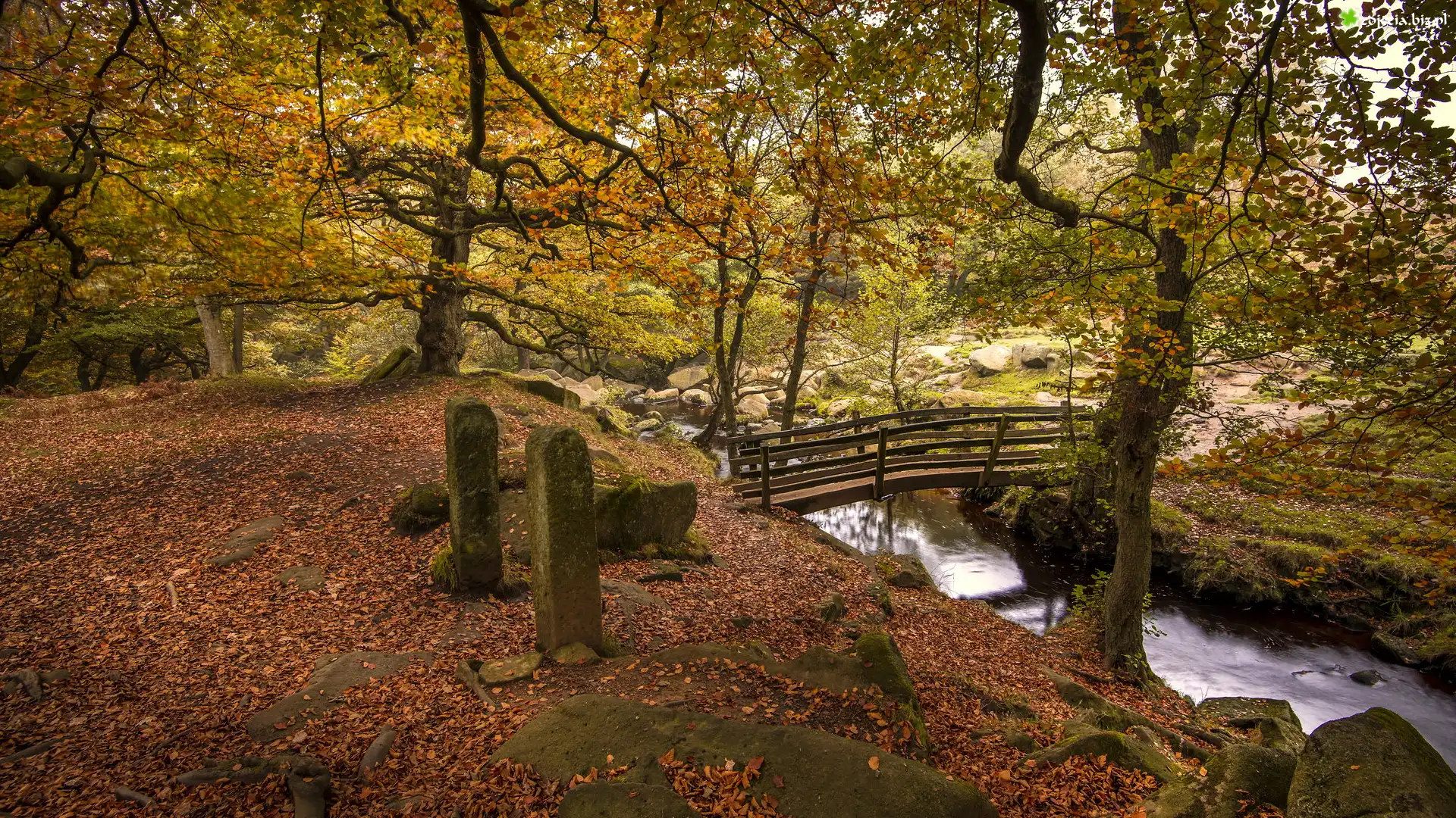 Zdjęcie Rzeczka, Mostek, Betonowe, Słupki, Drzewa, Jesień