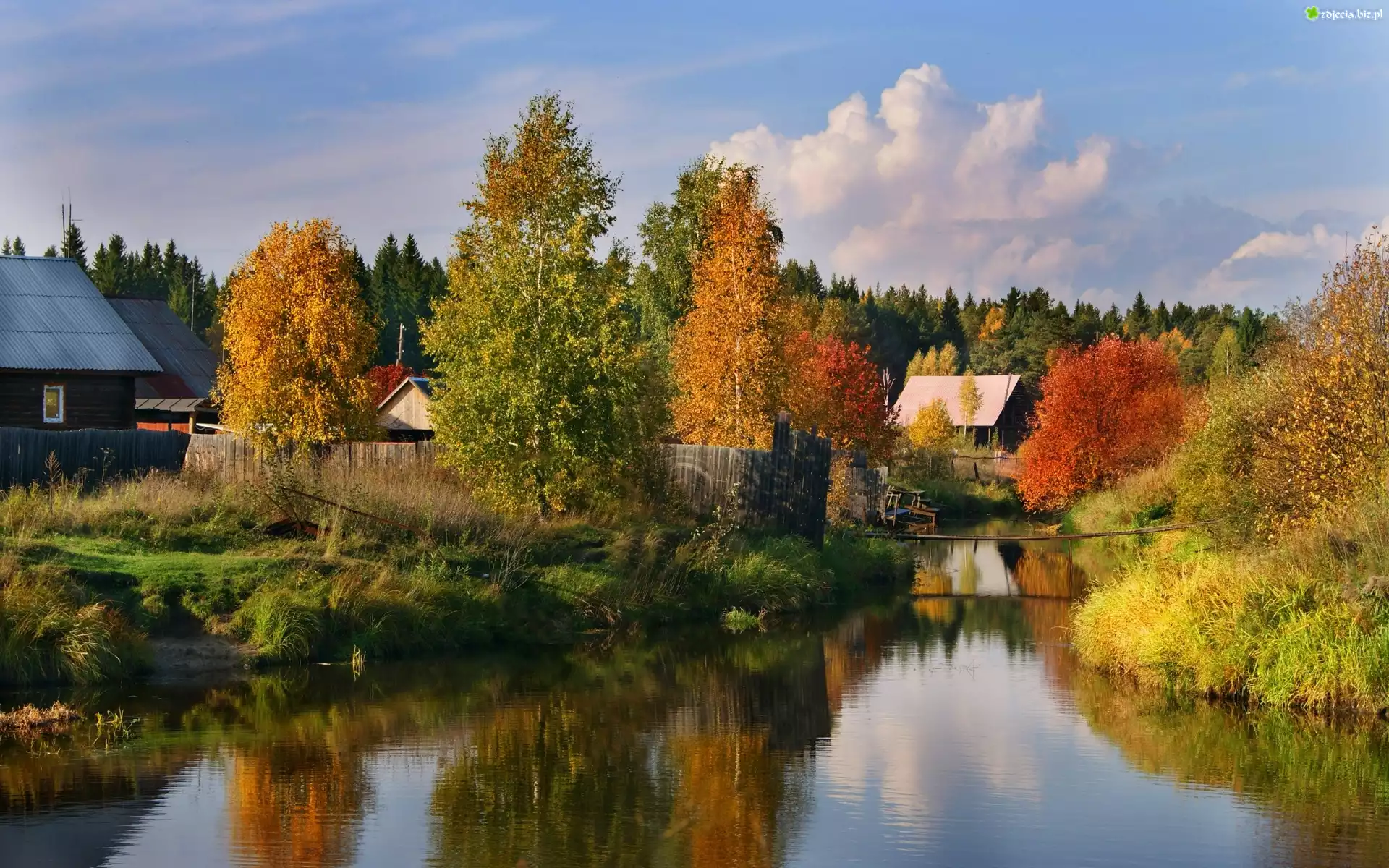 Zdjęcie Rzeczka, Zabudowania, Las, Kolorowe, Drzewa, Jesień