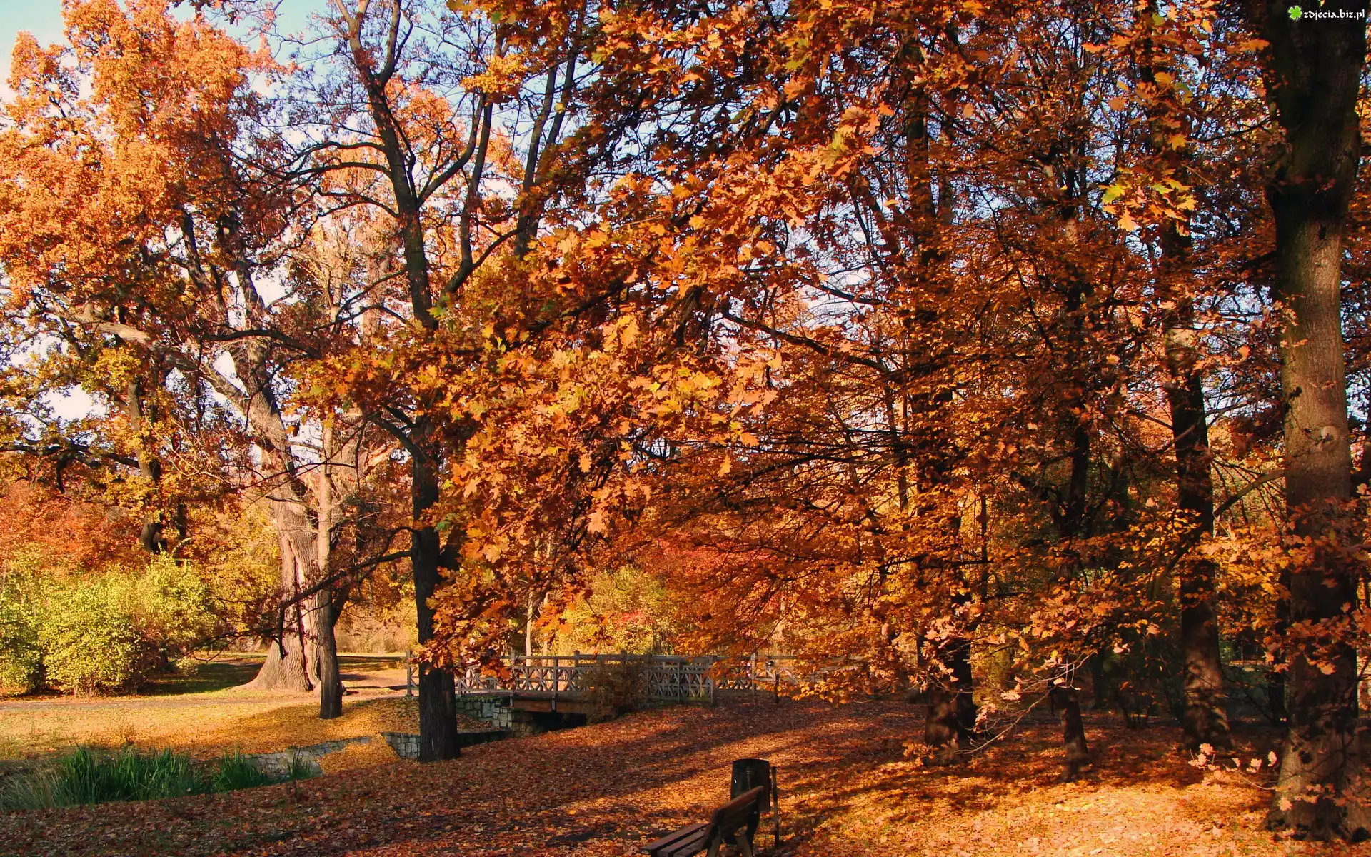 Zdjęcie Rzeczka, Mostek, Alejki, Ławka, Park, Jesień