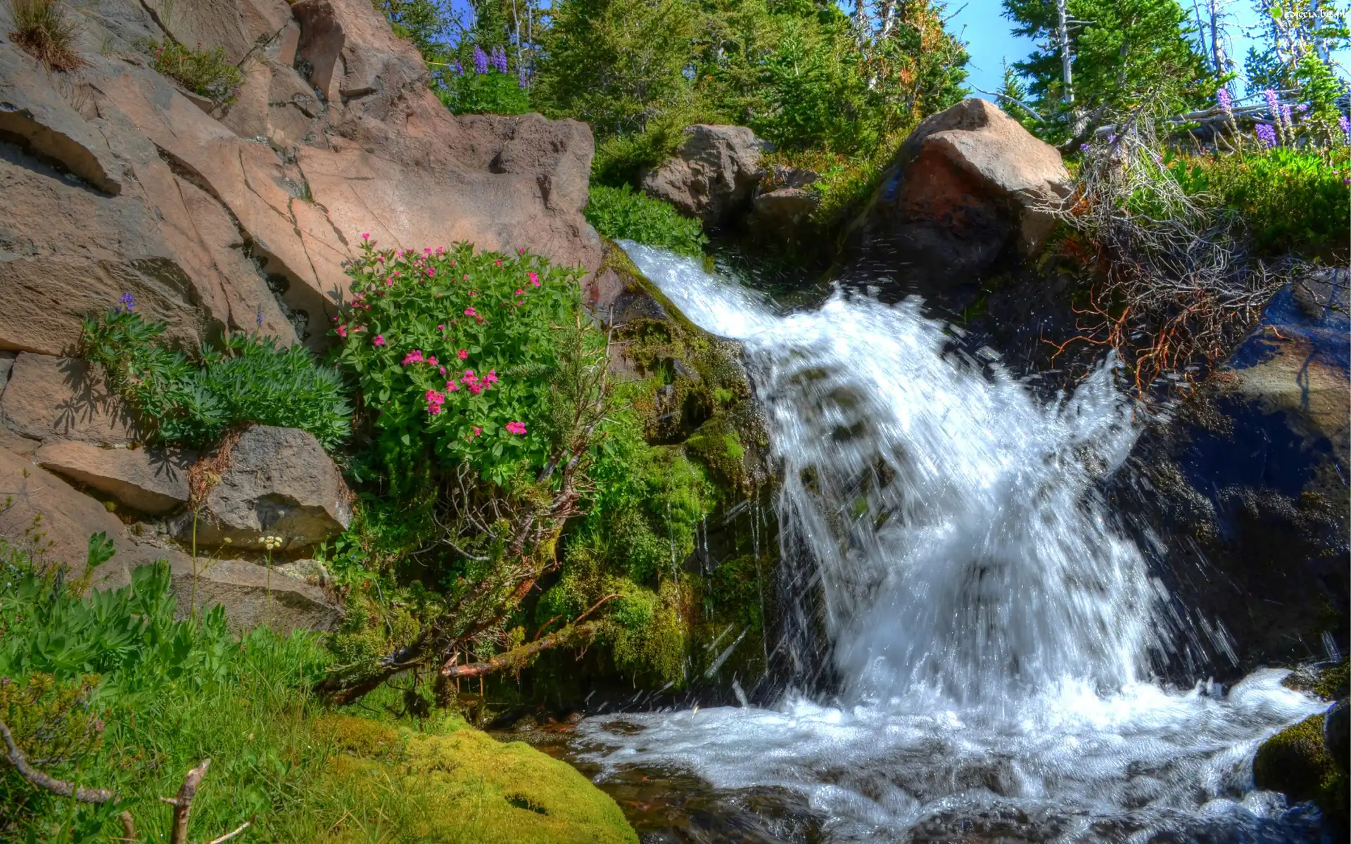 Zdjęcie Rzeczka, Potok, Kamienie, Skały, Kwiaty