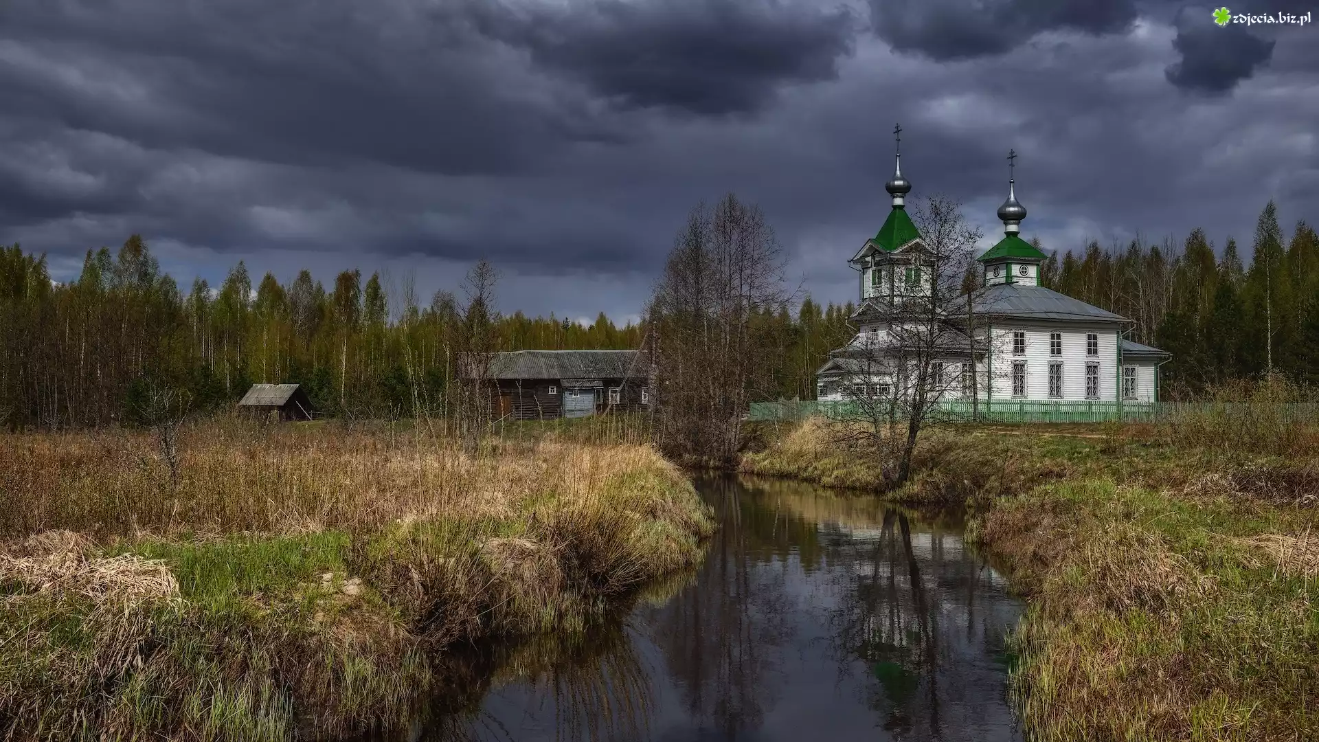 Zdjęcie Cerkiew, Rzeka, Chmury, Łąka, Drzewa