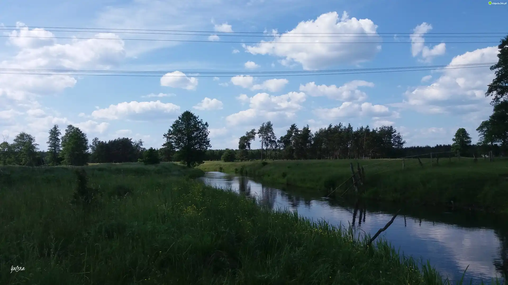 Zdjęcie Rzeka, Drzewa, Niebo, Chmury, Łąka