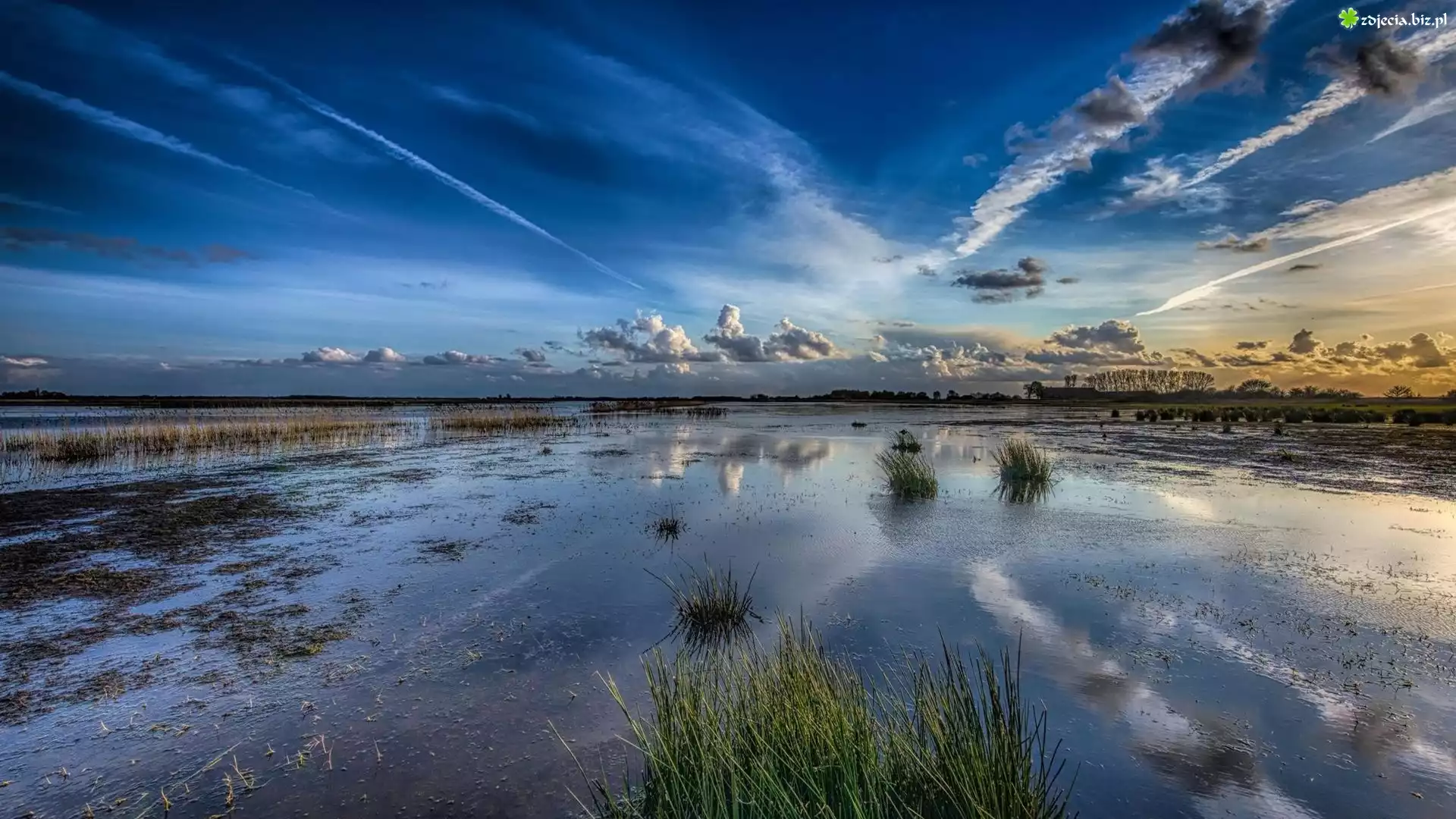 Zdjęcie Rzeka, Trawa, Chmury, Odbicie