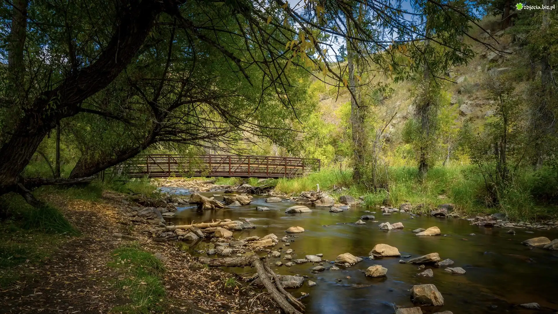 Zdjęcie Rzeka, Most, Drzewa, Ścieżka, Kamienie