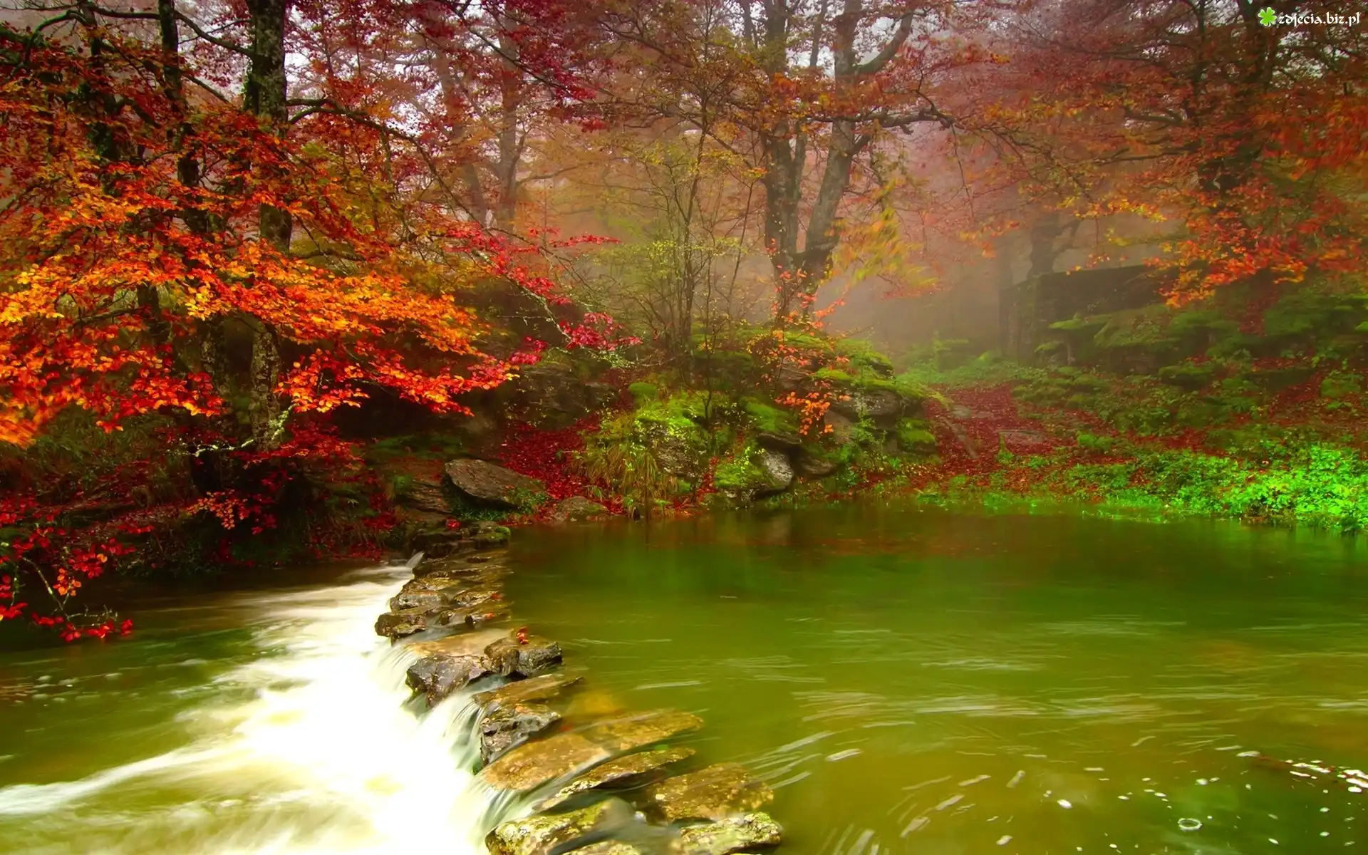 Zdjęcie Rzeka, Zielona, Woda, Czerwone, Liście
