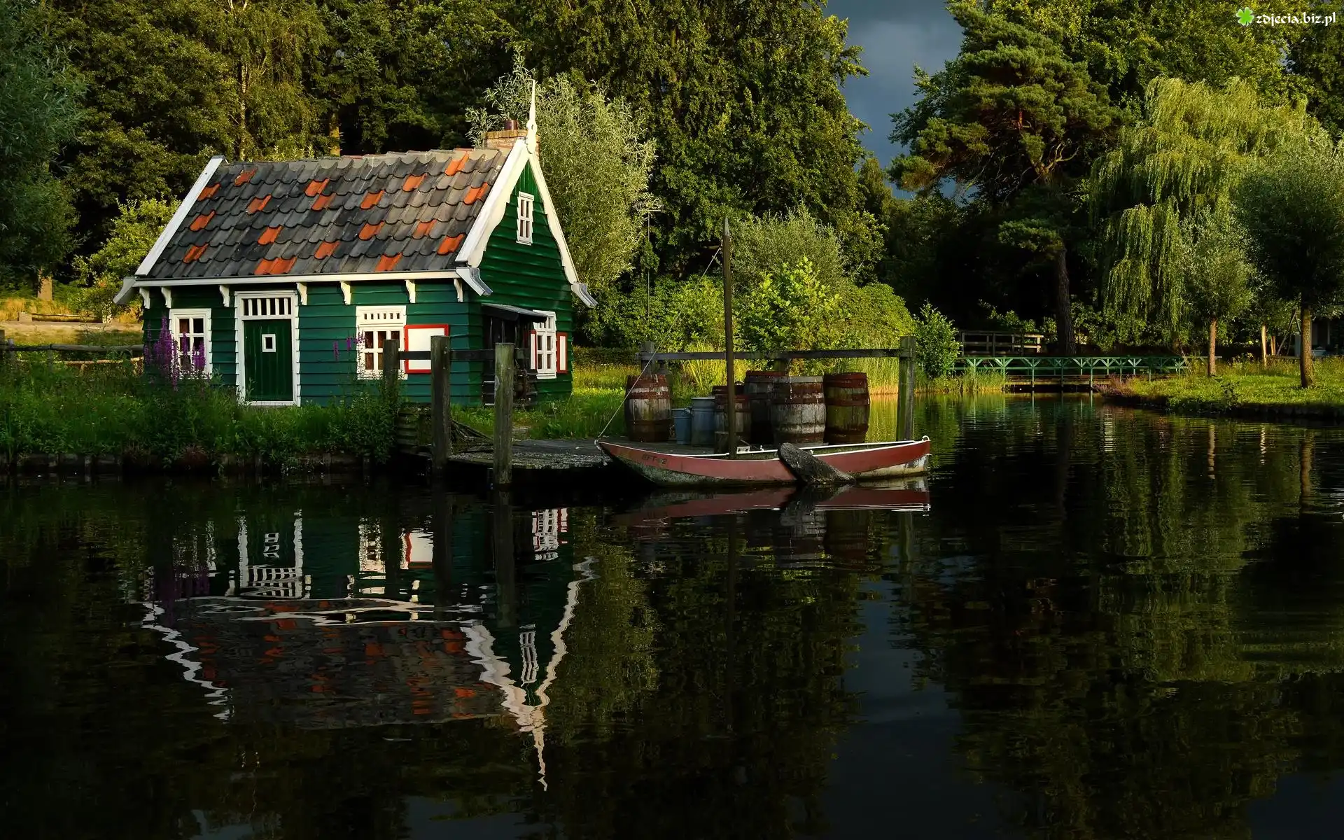 Zdjęcie Rzeka, Most, Łódka, Domek, Las