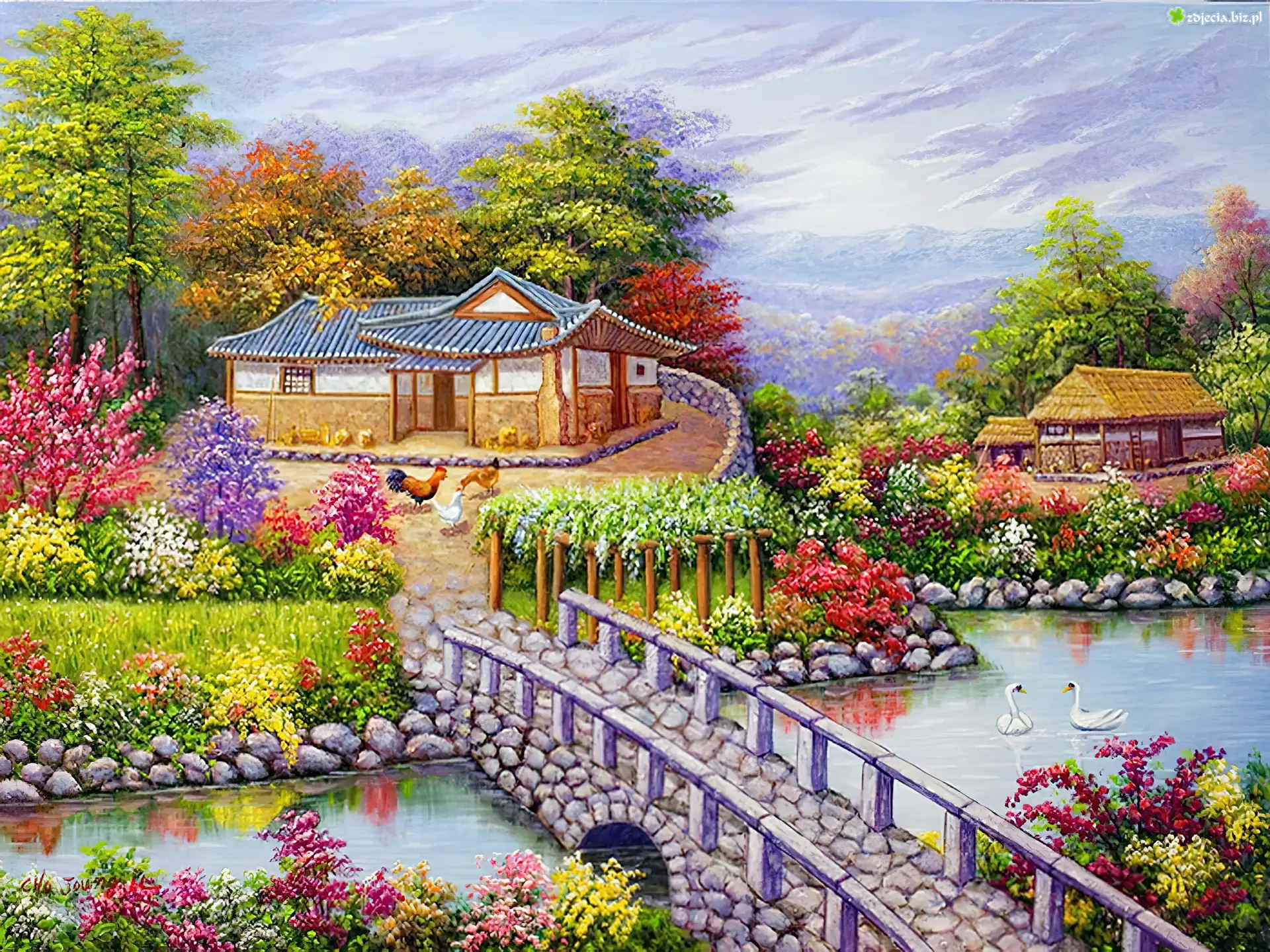 Zdjęcie, Rzeka, Most, Domy, Ogrody