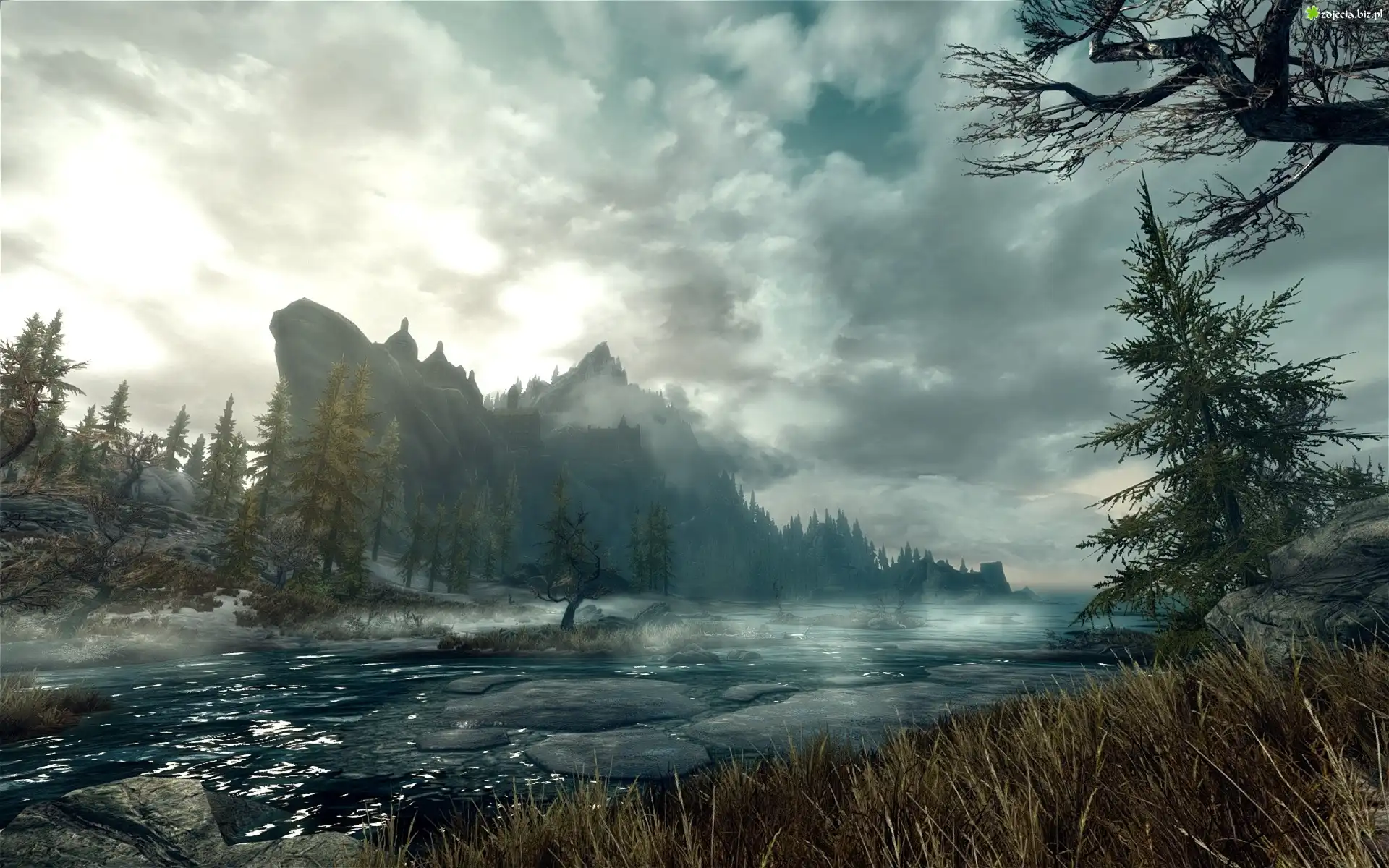 Zdjęcie Rzeka, Kra, Drzewa, Chmury