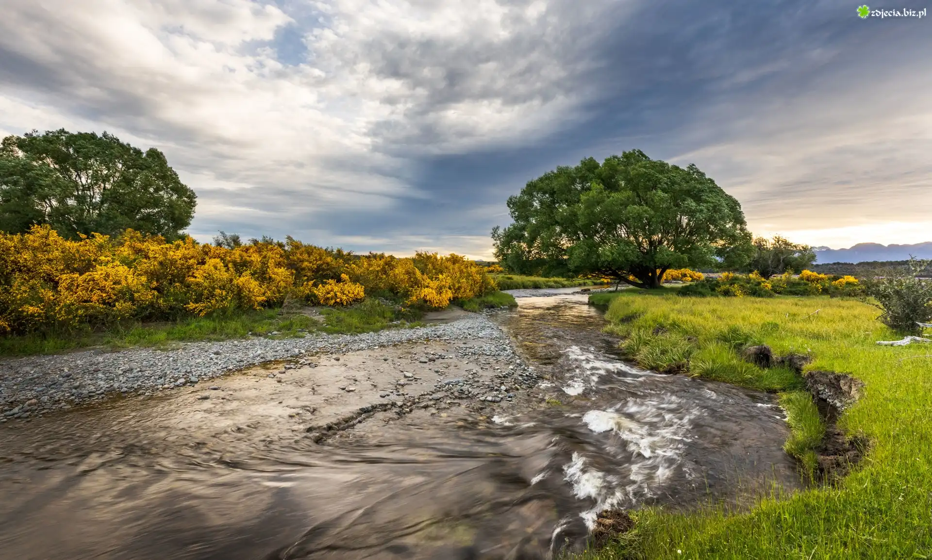 Zdjęcie Rzeka, Krzewy, Drzewa, Chmury