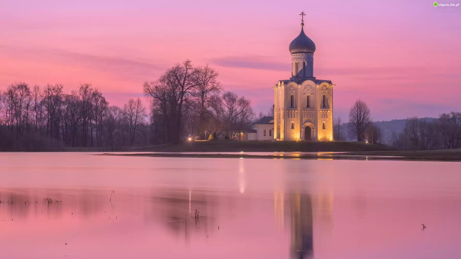 Zdjęcie Cerkiew, Rzeka, Drzewa, Zaróżowione, Niebo