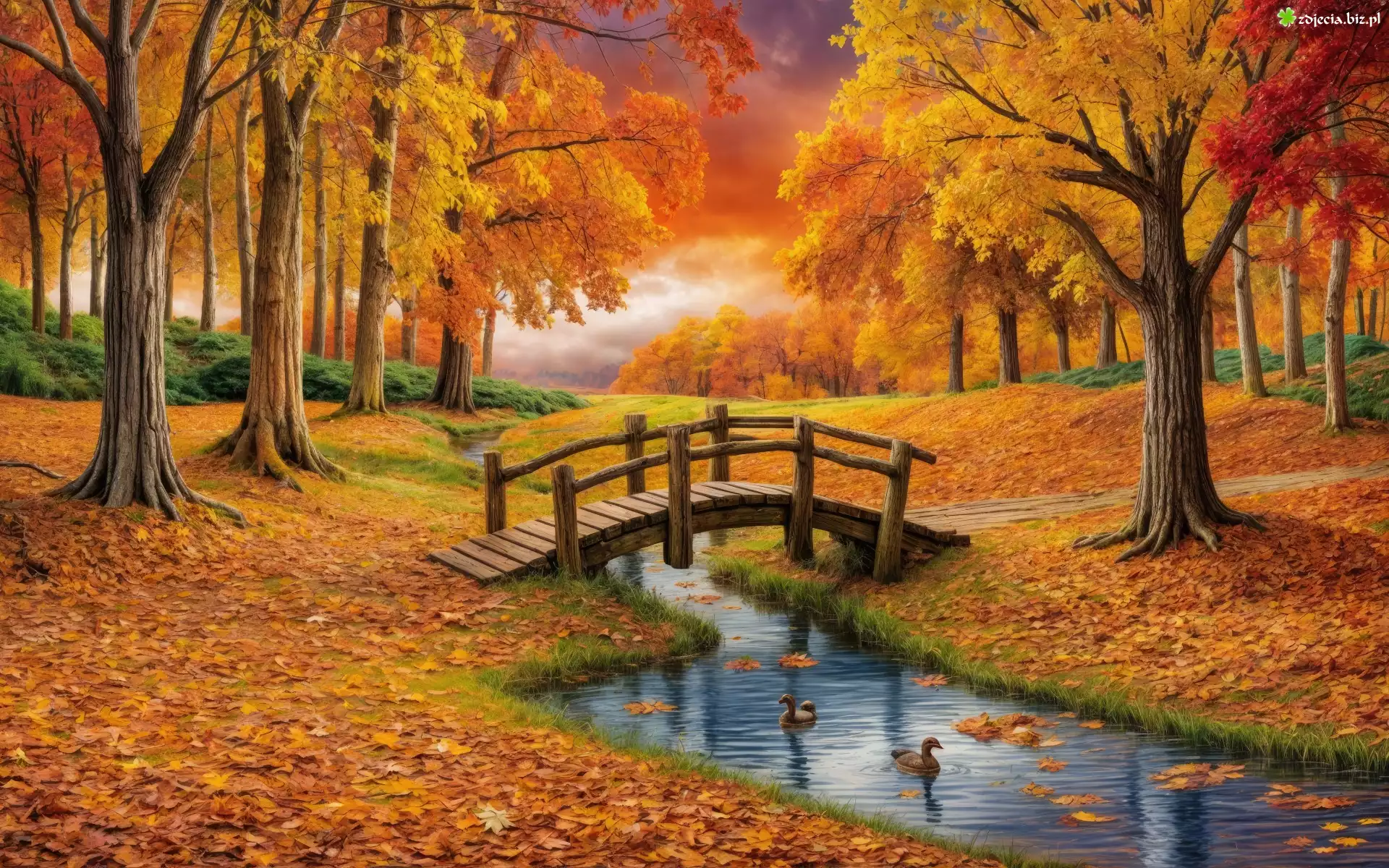 Zdjęcie Jesień, Pożółkłe, Drzewa, Rzeka, Strumień, Most, Grafika