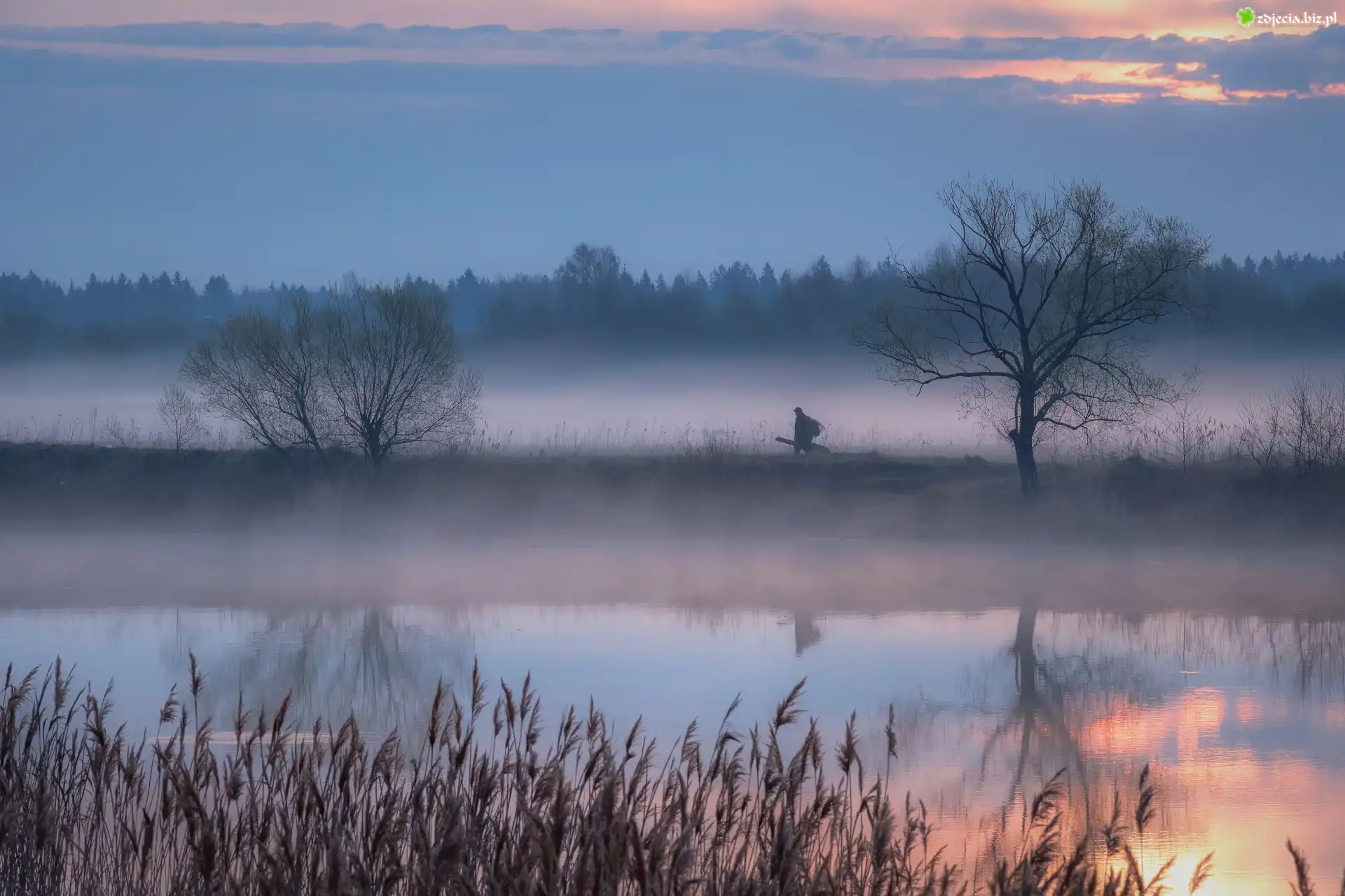 Zdjęcie Rzeka, Mgła, Trawy, Drzewa, Człowiek