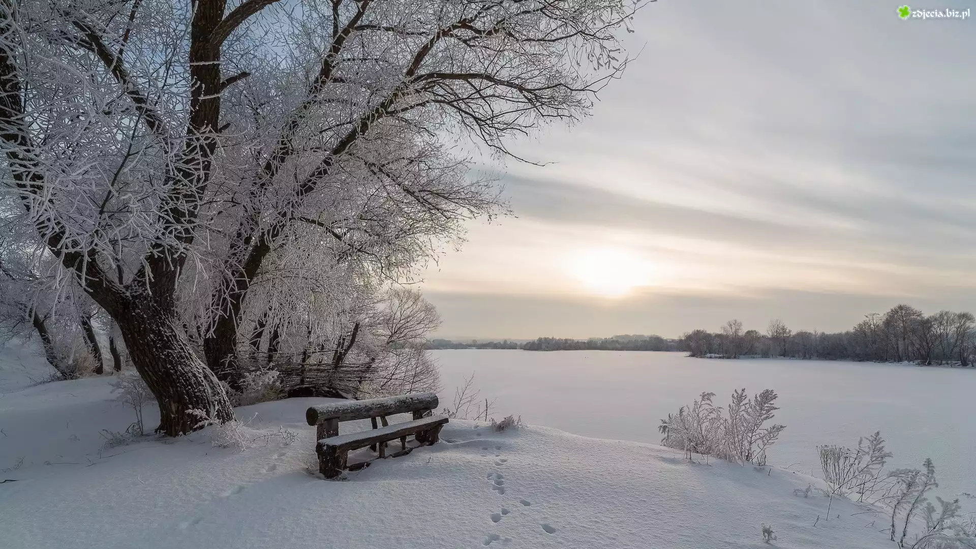 Zdjęcie Zima, Śnieg, Drzewo, Rzeka, Brzeg, Ławka, Poranek