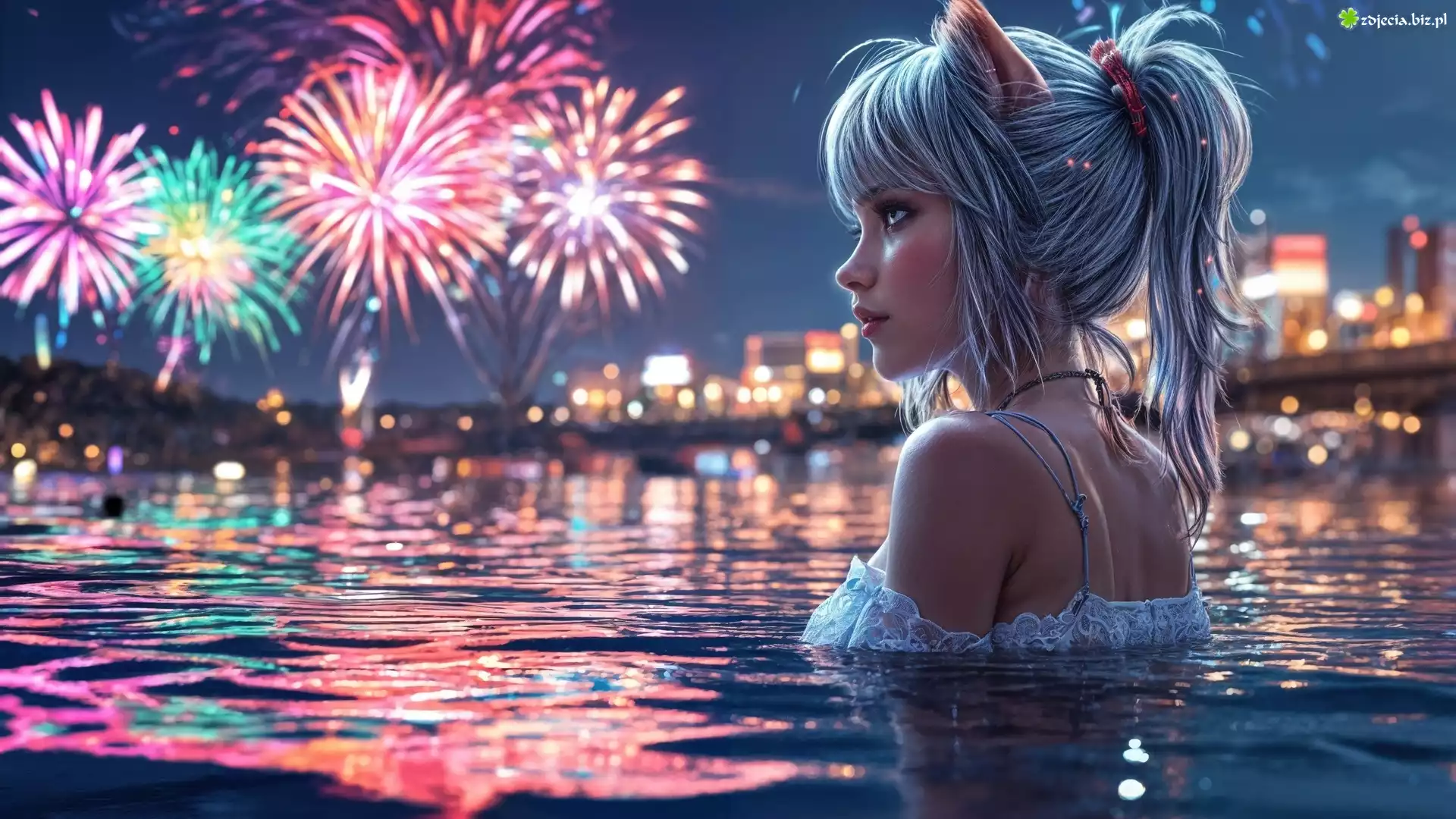 Zdjęcie Dziewczyna, Jasne, Włosy, Rzeka, Miasto, Fajerwerki