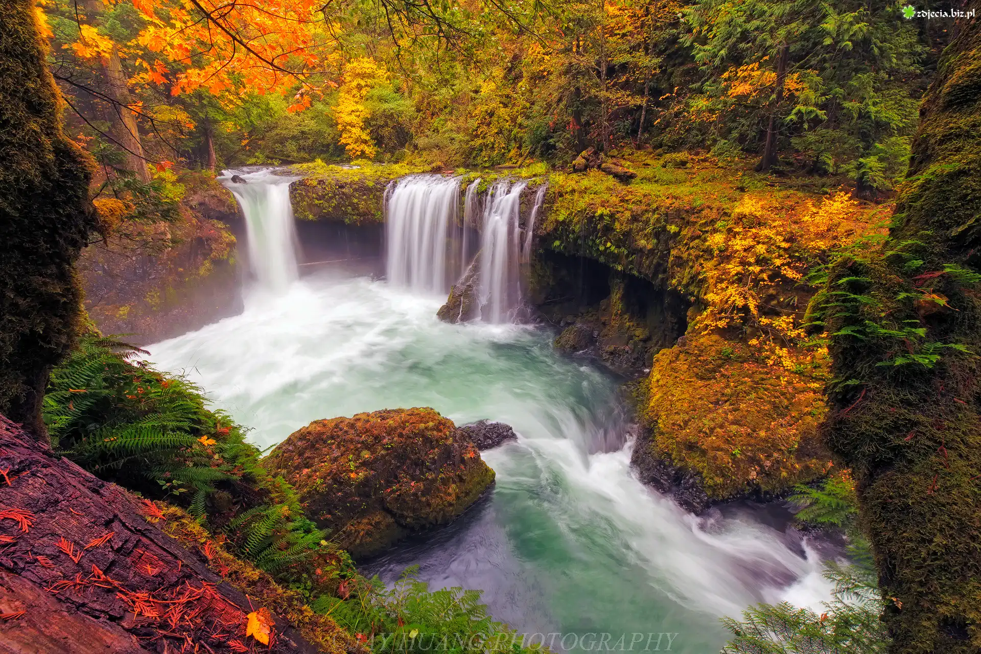 Zdjęcie Rzeka White Salmon River, Wodospad Spirit Falls, Rezerwat przyrody Columbia River Gorge, Drzewa, Krzewy, Skały, Jesień, Oregon, Stany Zjednoczone |