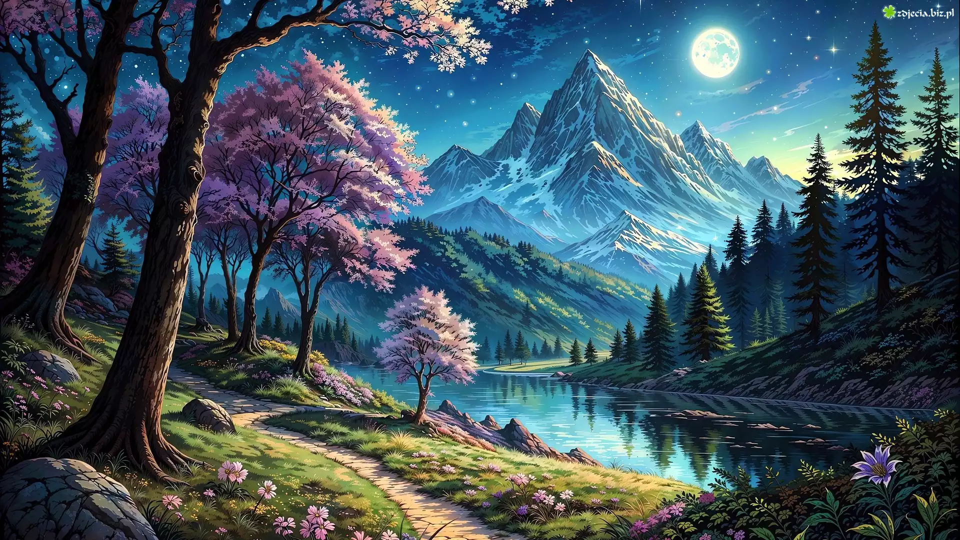 Zdjęcie Grafika AI, Góry, Rzeka, Drzewa, Droga, Kwiaty