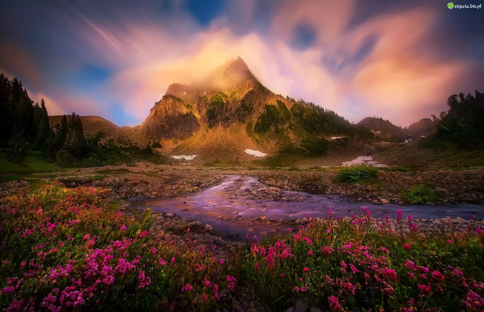 Zdjęcie, Góry, Rzeka, Kwiaty