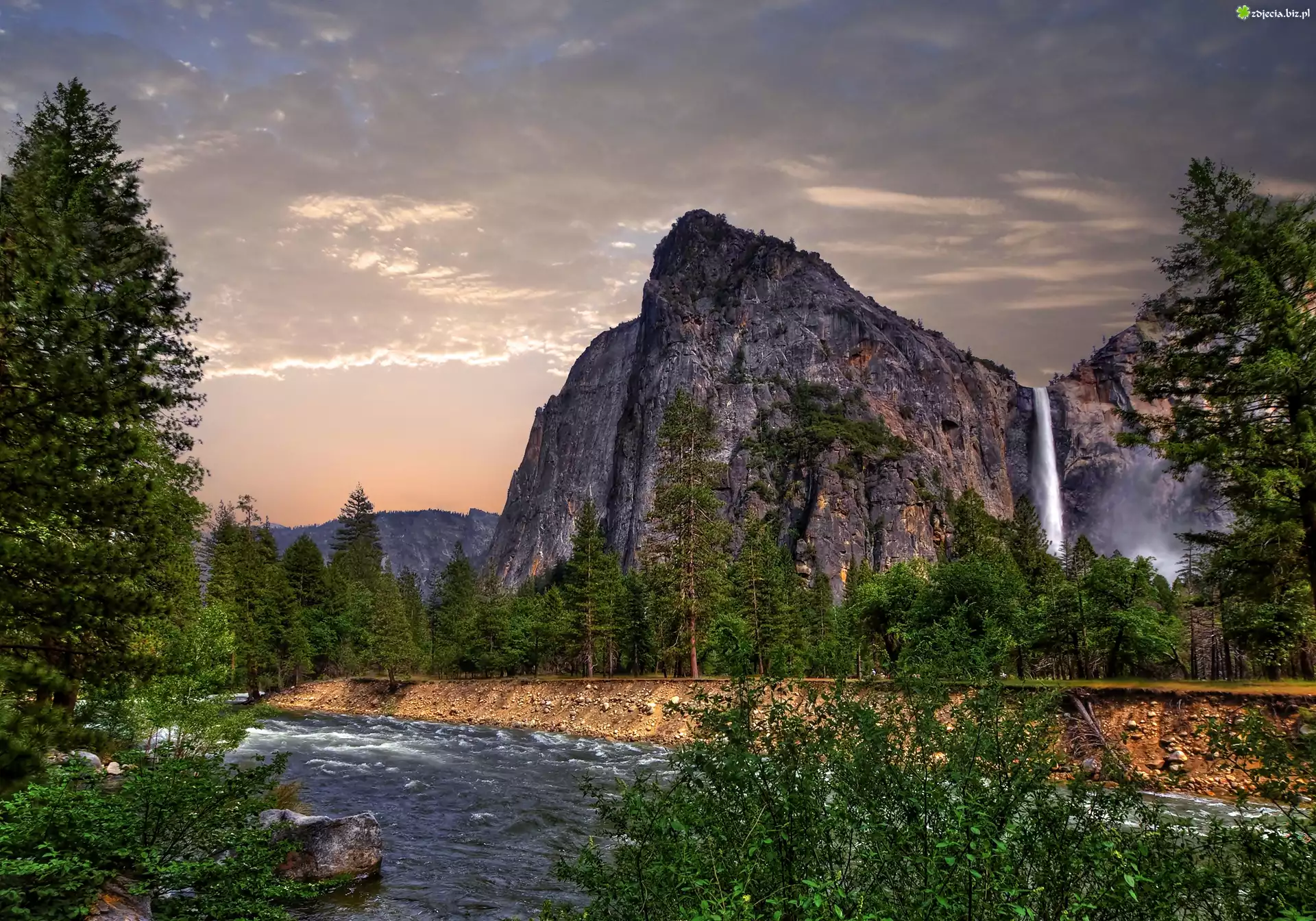 Zdjęcie, rzeka, Lasy, Góry, Wodospad
