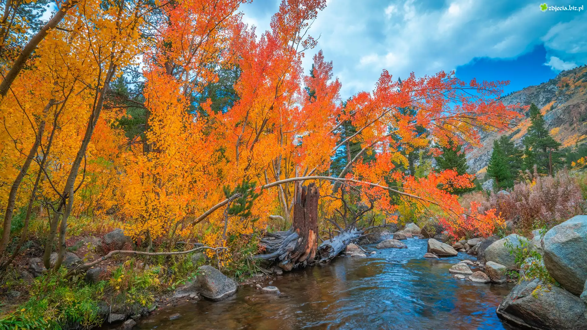 Zdjęcie Rzeka, Drzewa, Krzewy, Jesień, Kamienie