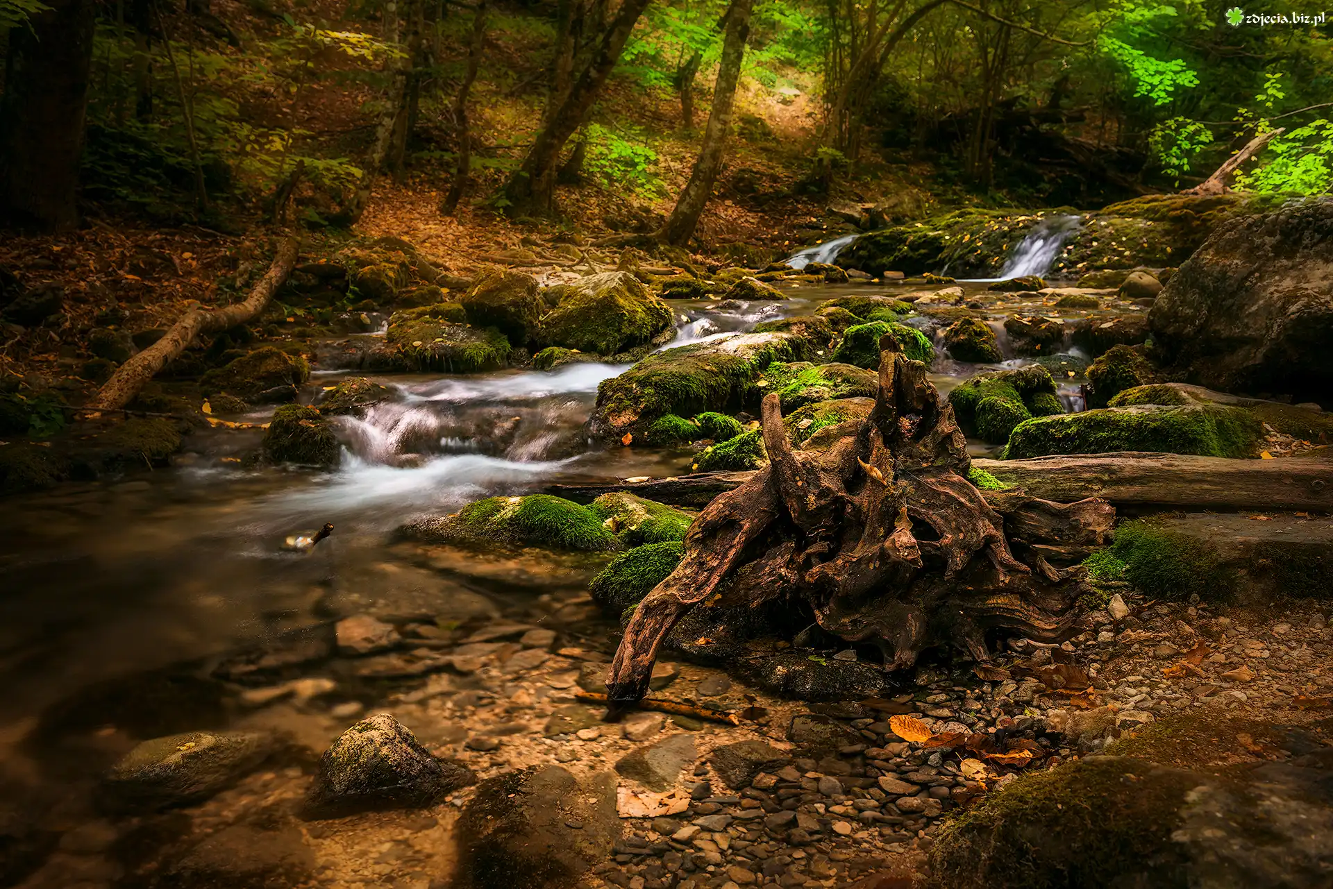 Zdjęcie Rzeka, Las, Konary, Kamienie, Mech