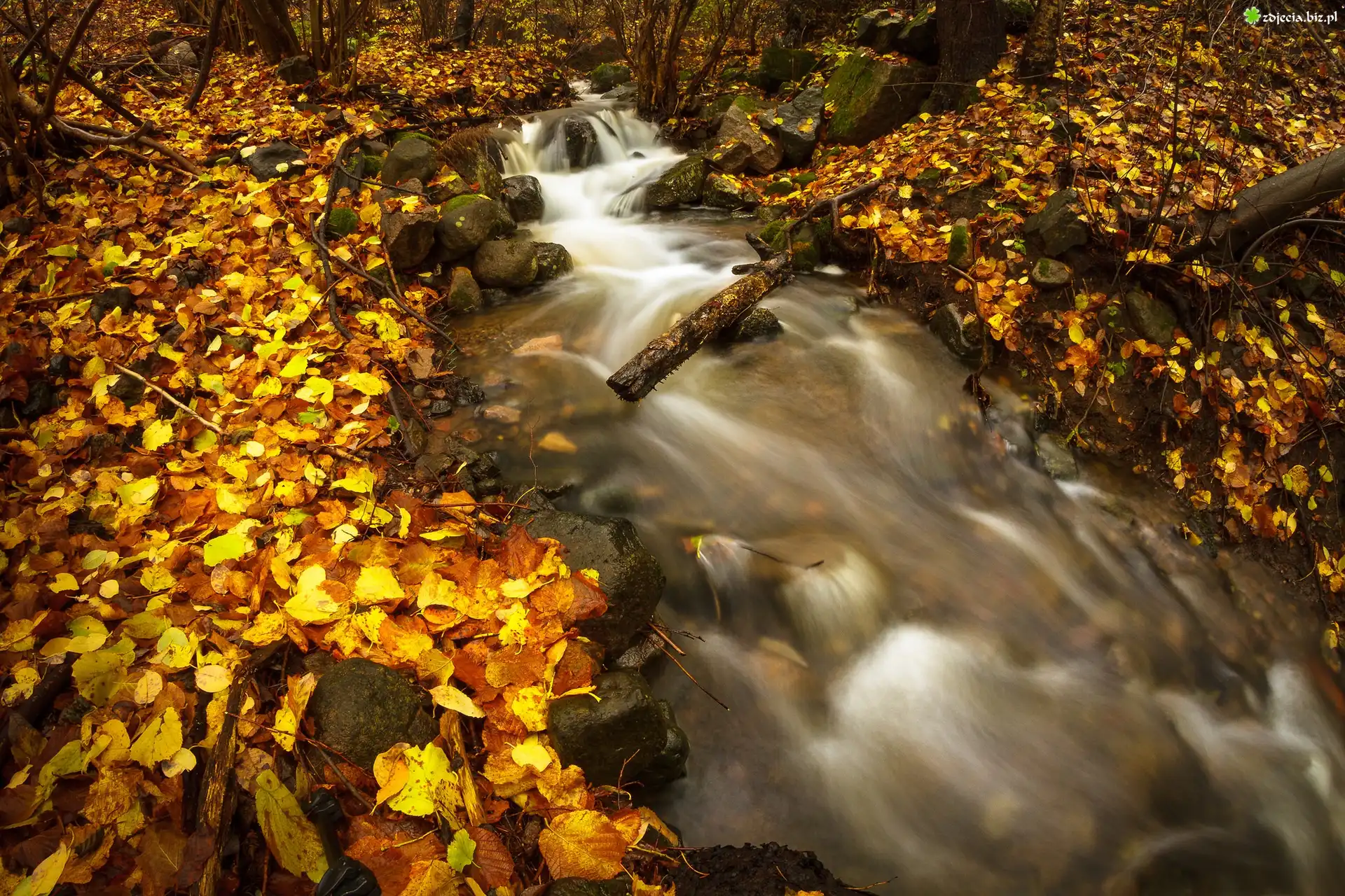 Zdjęcie Rzeka, Opadłe, Liście, Kamienie, Gałęzie