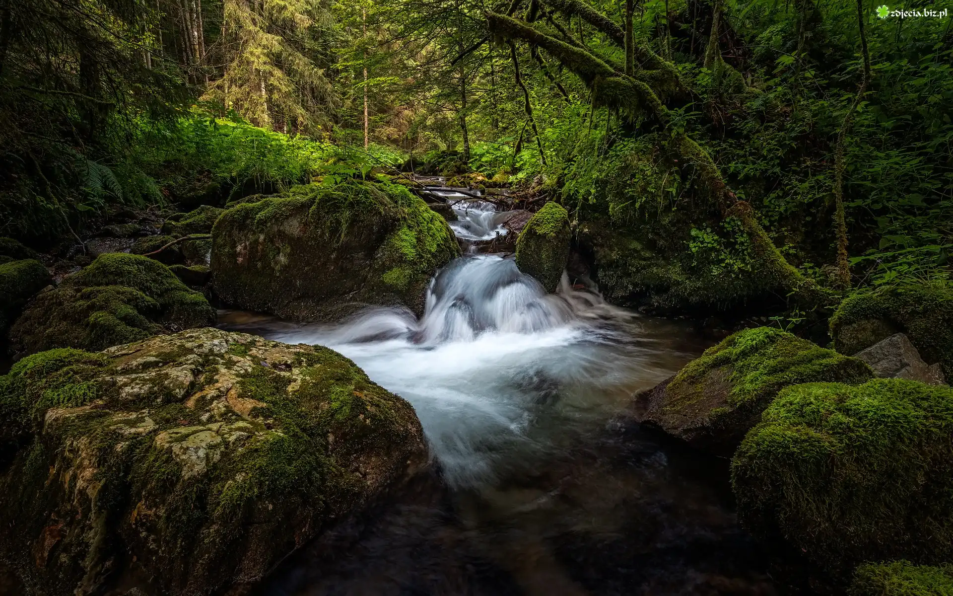 Zdjęcie Las, Rzeka, Kamienie, Drzewa, Roślinność