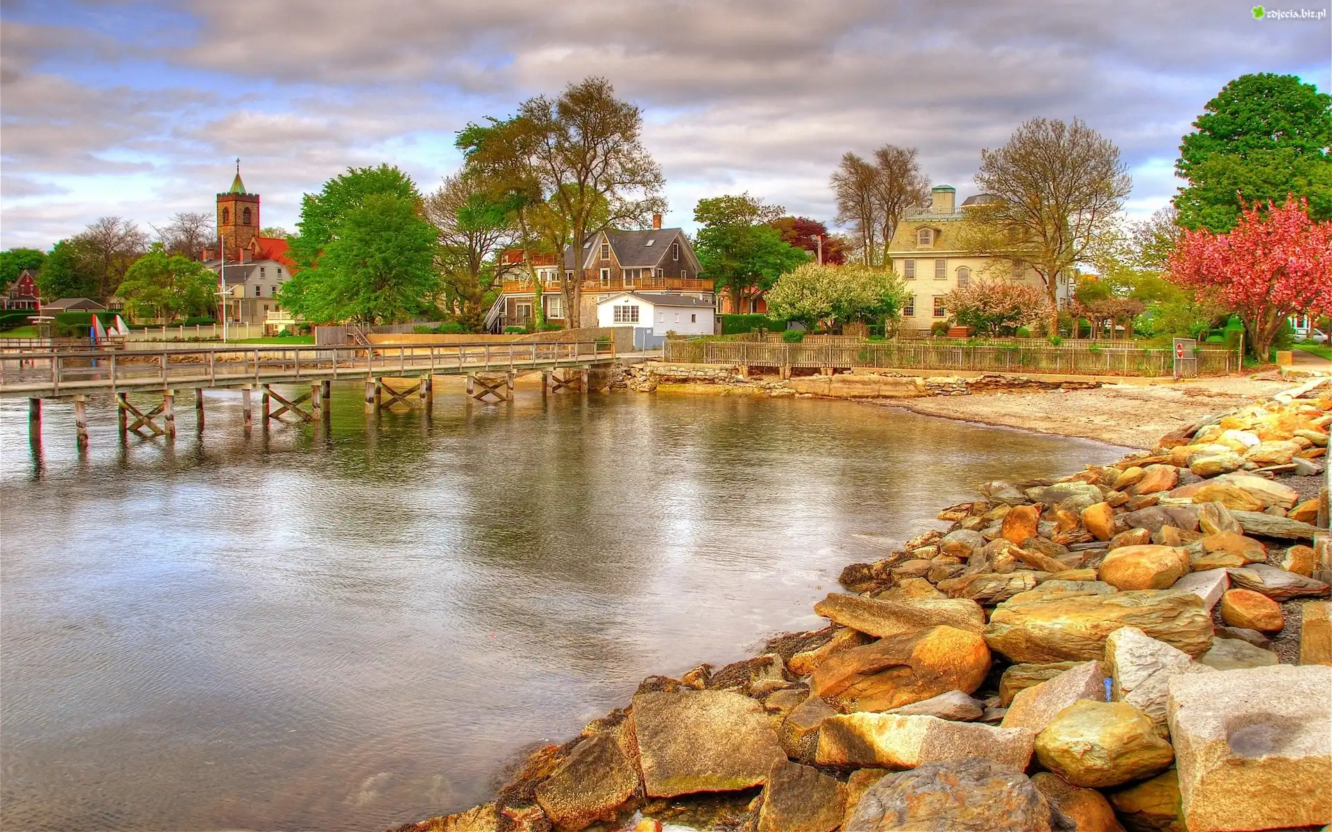 Zdjęcie Rzeka, Kamienie, Domy, Kościół, Drzewa
