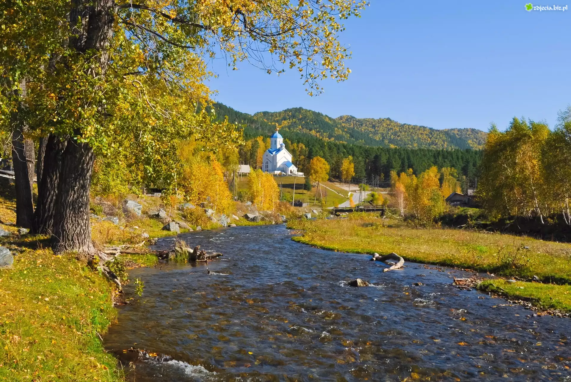 Zdjęcie Rzeka, Las, Drzewa, Jesień, Kościół, Prawosławny