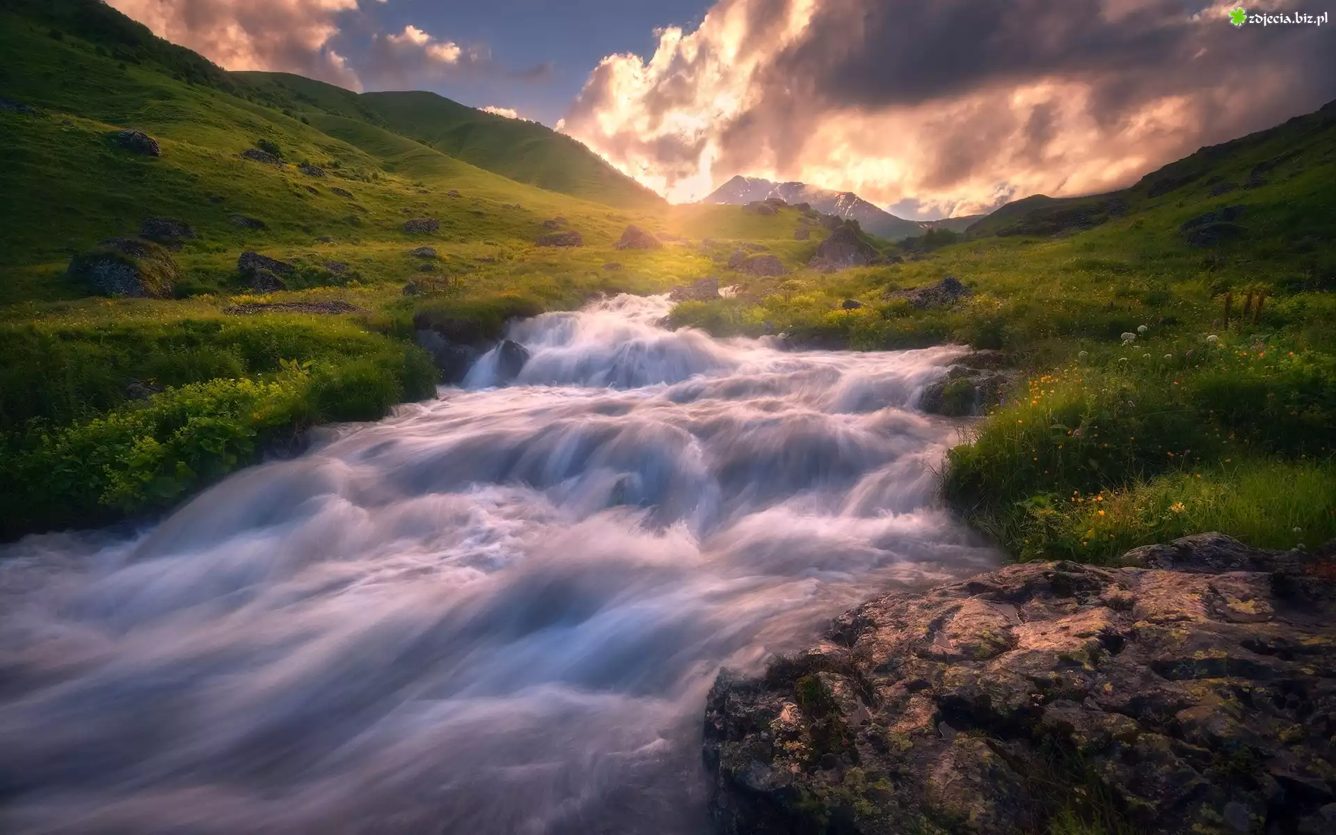 Zdjęcie Rzeka, Góry, Łąka, Kwiaty, Kamienie