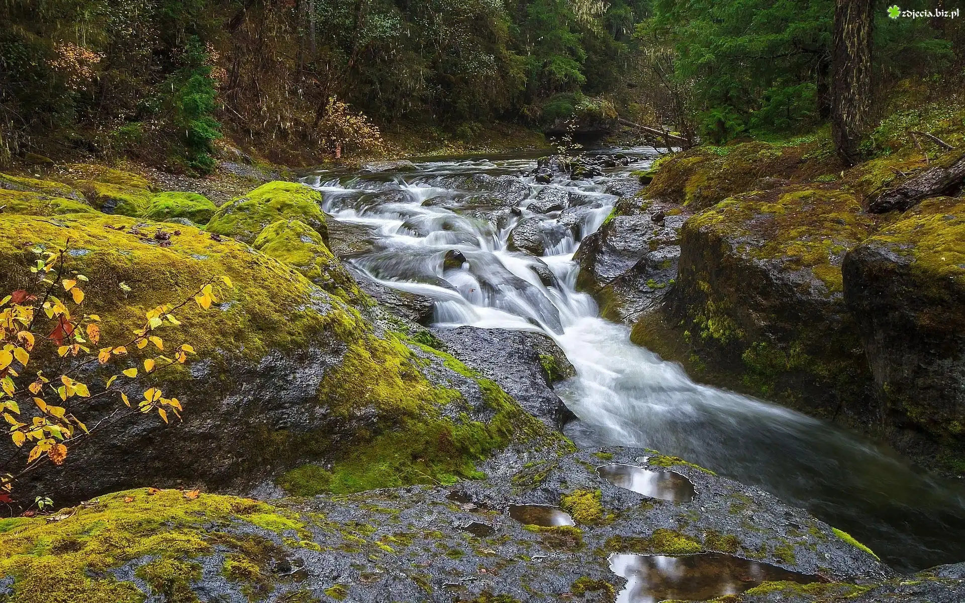 Zdjęcie Rzeka, Skały, Mchy, Las, Jesień