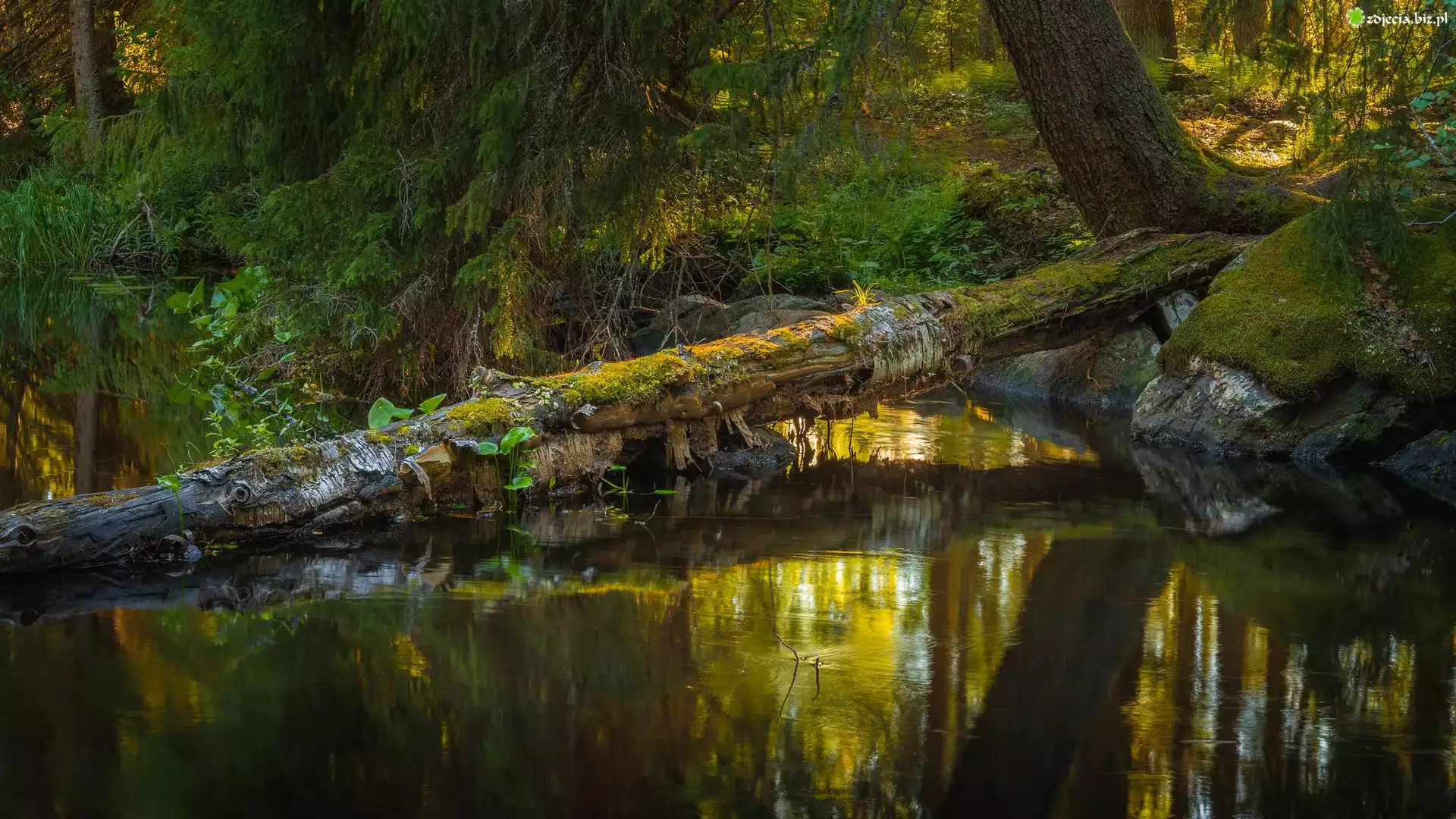 Zdjęcie, Las, Rzeka, Powalone, Drzewo, Omszały, Kamień, Rośliny